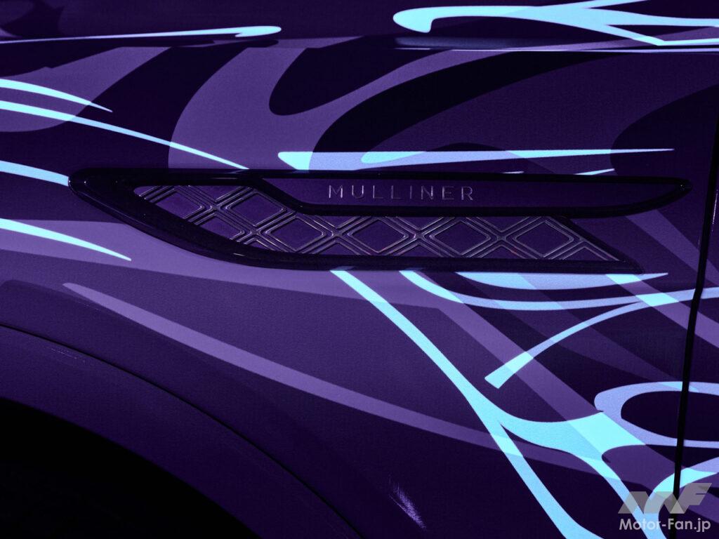 「外観には、ボンネットを飾る精巧なテッセレーションパターンが取り入れられ、旅の始まりに感じる高揚感を象徴しています。視線が車体の側面へと移るにつれ、まるで水滴が広がるような滑らかなリップルパターンへと変化し、ベントレーのシグネチャーデザインであるアズールダイヤモチーフを生み出します。このシームレスなデザインの移り変わりは、ベントレーでのドライブによって生まれる旅への満足感を見事に表現しています。また、バンバン氏のおかげで、ベントレーのパフォーマンスを追求したスピードレンジを連想させる、ダイナミックで力強いエネルギーがこの車両から感じることができます。発表時にはブラックライトが照射されると、パフォーマンスの力強さを象徴するダイナミックなアートワークが鮮やかに浮かび上がりました。このアートワークは、ベントレーの洗練されたデザインと見事に調和し、静けさとダイナミックの絶妙なバランスを表現しています。この一台は、ベントレーの未来を切り開く革新の基盤を築きました」