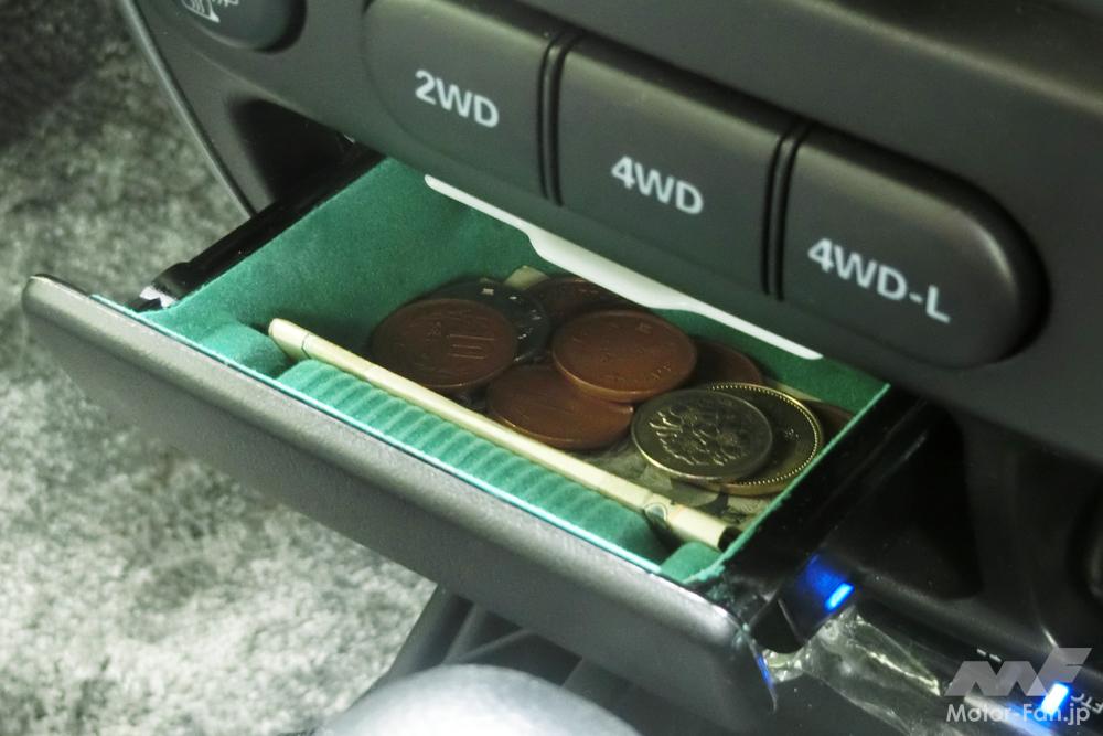 これくらいのサイズのもの入れ、いまのひとは音楽を入れたUSB、スマートホンとナビを接続するコード、Bluetooth機器を入れる場所としてもいいと思うのだが。