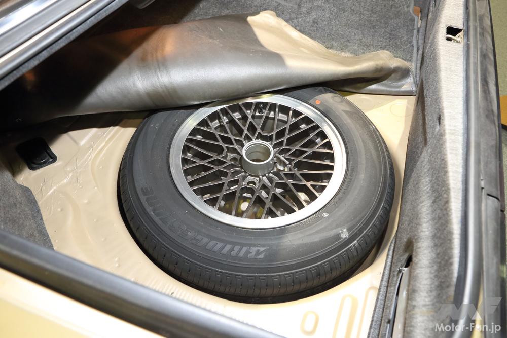 ついこの間まで主流だった応急用タイヤが認可されたのは1981年3月12日のことだ。発表・発売が1981年2月27日だった初代ソアラのトランクに応急用タイヤが収まっているはずはなく、厚いマットをめくれば走行用タイヤ(グランドタイヤ)そのままのスペアタイヤが顔を出す。ホイールまでグランドタイヤと同じアルミホイールというありさまだ。