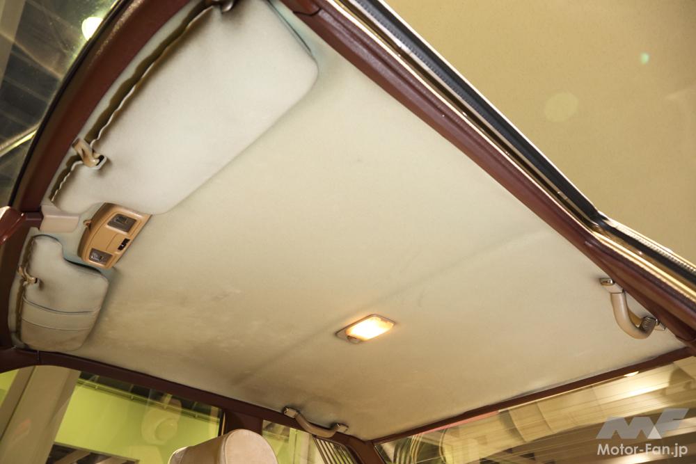 初代ソアラ時代にもなると進化していて、表面は布、というよりカーペットと同じような素材で乗員を頭からやさしく包み込む。もっともソアラより前の、この頃生産されていた最後のFRカローラでも上級機種はこのタイプだったと記憶するから、ソアラならなおのこと当然のルーフトリミングだろう。