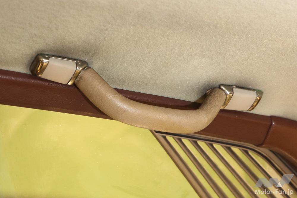 後席ルーフサイドにはアシストグリップがある。さすが高級スペシャルティ、留めるボルト隠しの部分はゴールドのめっき仕立てだ。
