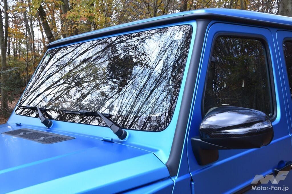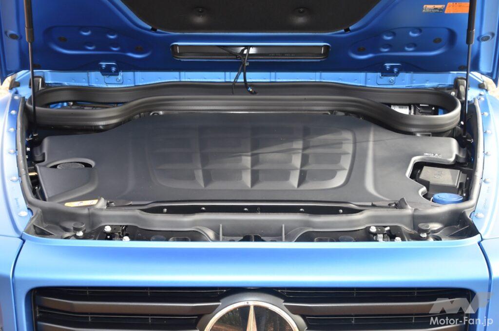 新型Gクラスはシリーズ全体としてAピラー表面に樹脂性パネルを装着し、ルーフ前端リップスポイラーを装着。またフェンダーに仕込んだスリットでタイヤハウスの乱流を排出するなどして、その空気抵抗を低減させている。これがさらにG580になると、ボンネット形状を改めることで、Cd値を0.44まで抑えた。今回は高速巡航までできなかったが、改めてその電力消費具合を確かめて見たいものだ。ちなみに公式データだと電費は、262Wh/km(WLTCモード)だ。