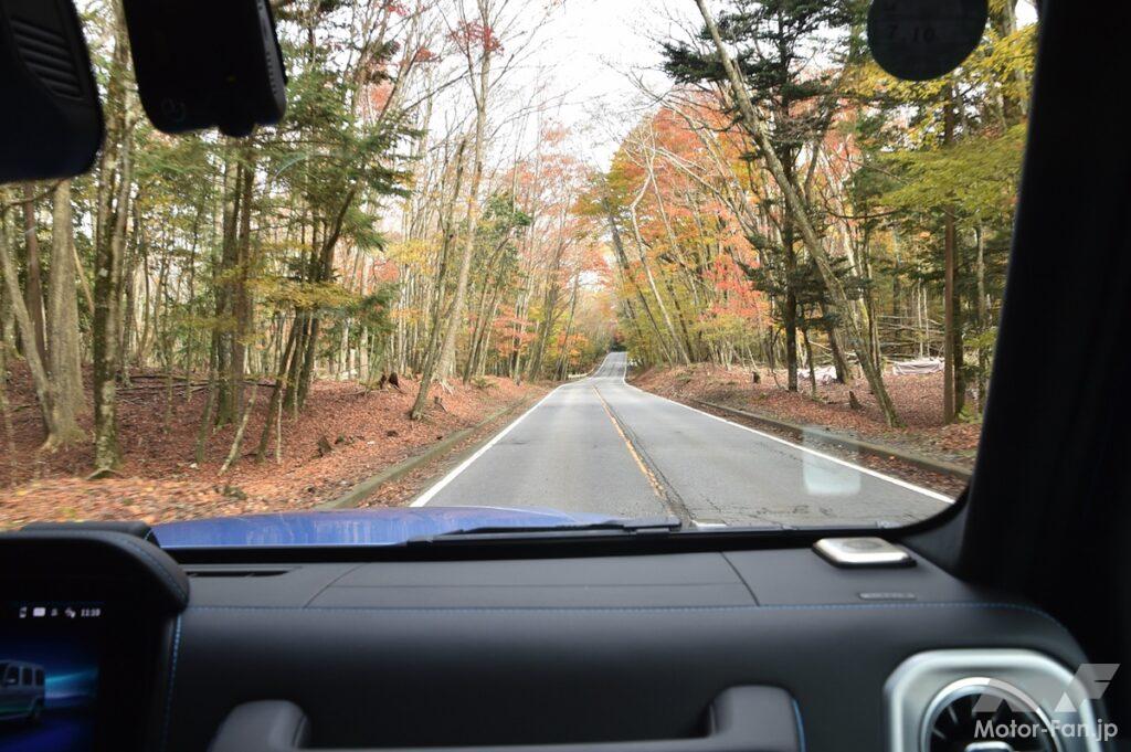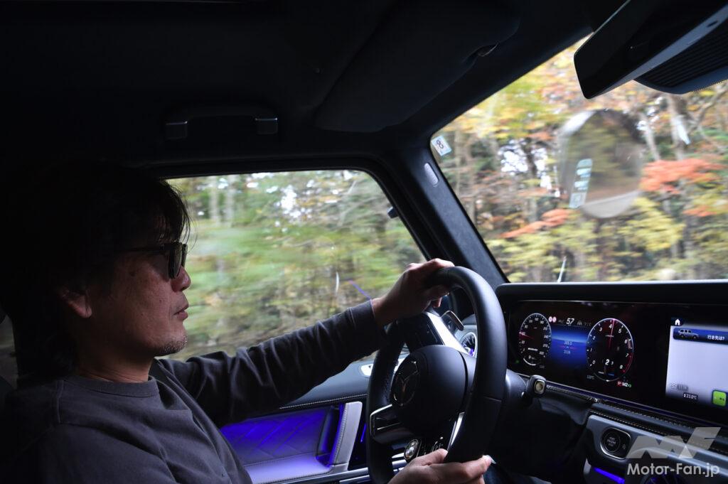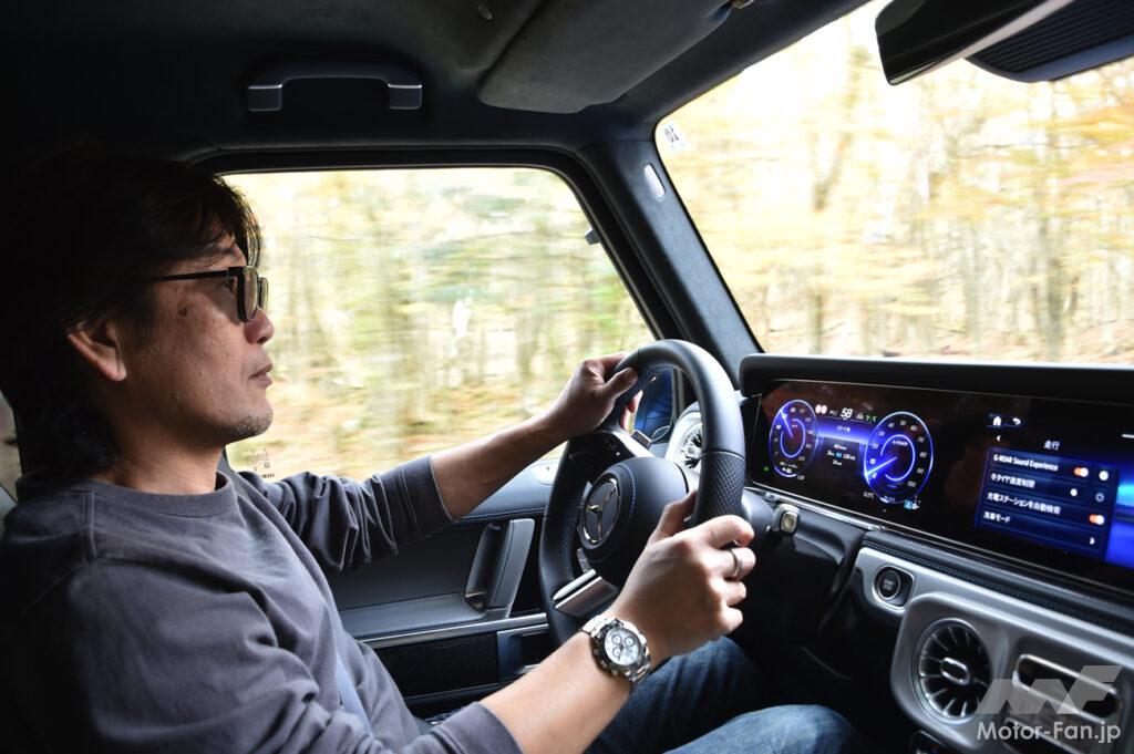スポーツモードに転じるとステアリングはさらに座り、足周りもほどよくロール剛性を上げて、その身のこなしが素晴らしくリニアになる。もちろんクーペスタイルSUVのような運動性能は得られないが、箱型のGクラスが実に気持ち良く走る。