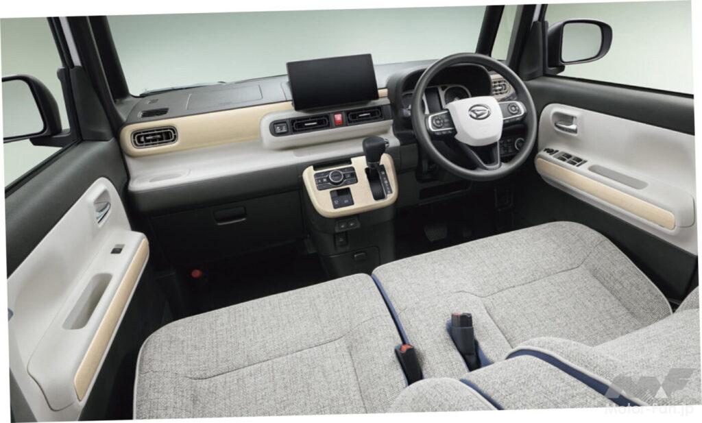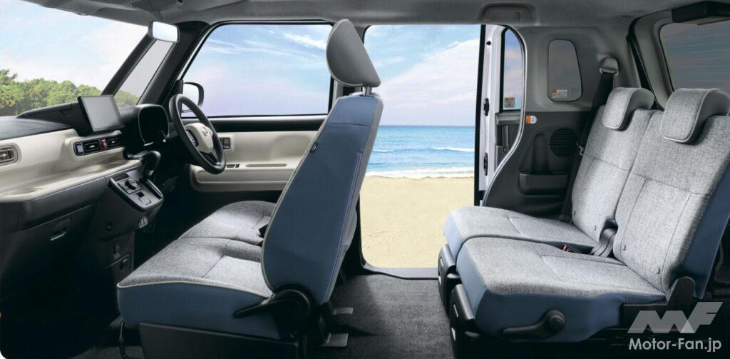室内は初代モデルよりもさらに広さと使い勝手が向上しています。後部座席には、左右独立でリクライニングやスライドが可能なシートが採用され、荷物や乗員に応じて柔軟にアレンジできます。シートをフルフラットにすることで、車中泊やアウトドアでの使用にも対応可能となっています。車内には20を超える収納スペースが設けられており、日常的な小物から買い物袋まで整理しやすい設計が特徴となっています。特に助手席下部の収納スペースやリヤシート下の引き出し式収納は便利だとユーザーから好評を博しています。さらに、ダイハツ初となる『ナノイーX』搭載のエアコンを標準装備し、車内の空気を清潔に保ちます。また、9インチの大型ディスプレイオーディオやスマートフォン連携機能もオプション設定され、快適性と利便性が大幅に向上しています。