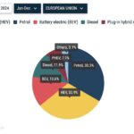 欧州はどうか。EU(欧州連合)もEFTA(欧州自由貿易連合=アイスランド/ノルウェー/スイス)も1〜11月のBEV販売累計は前年比マイナスだった。とくにマイナスが目立ったのはドイツで、1〜11月累計が前年比26%減の34.7万台にとどまった。理由はBEV補助金が終了したことと、景気悪化、電気代の高騰である。EUが中国製BEVに追加の関税をかけることを11月に決定したたことは、まだあまり影響していない。