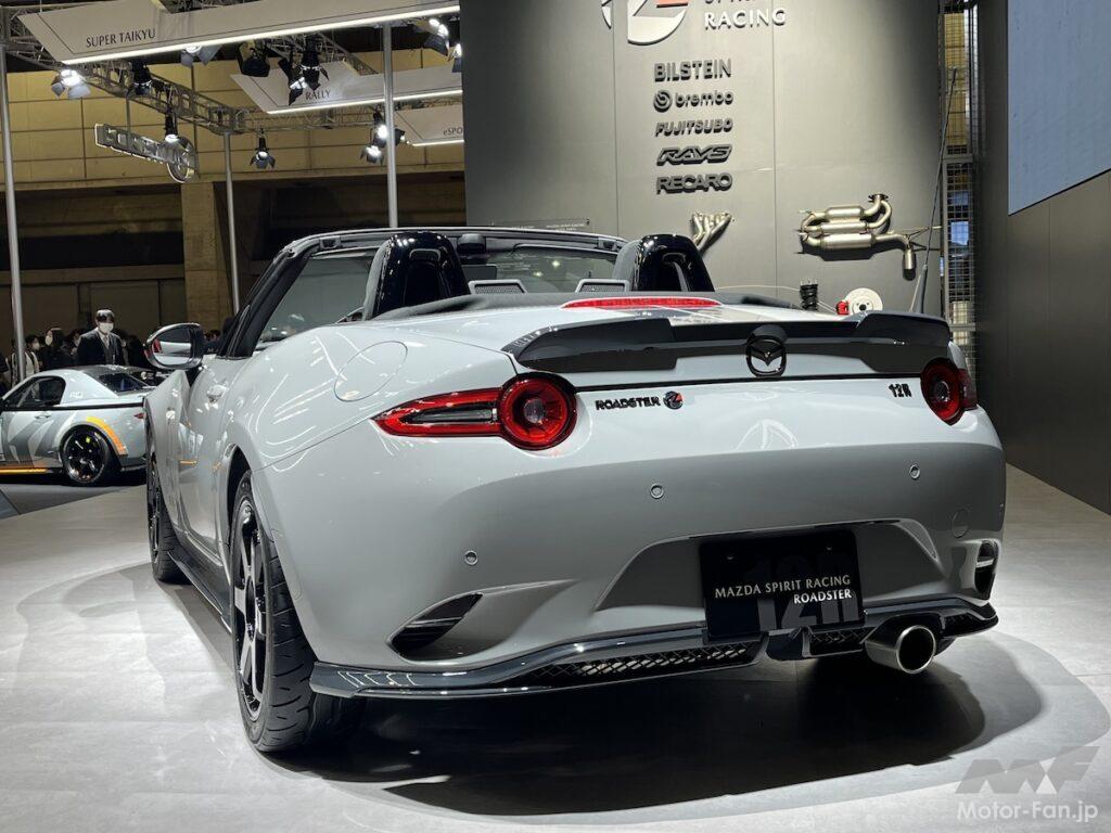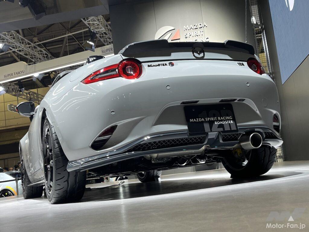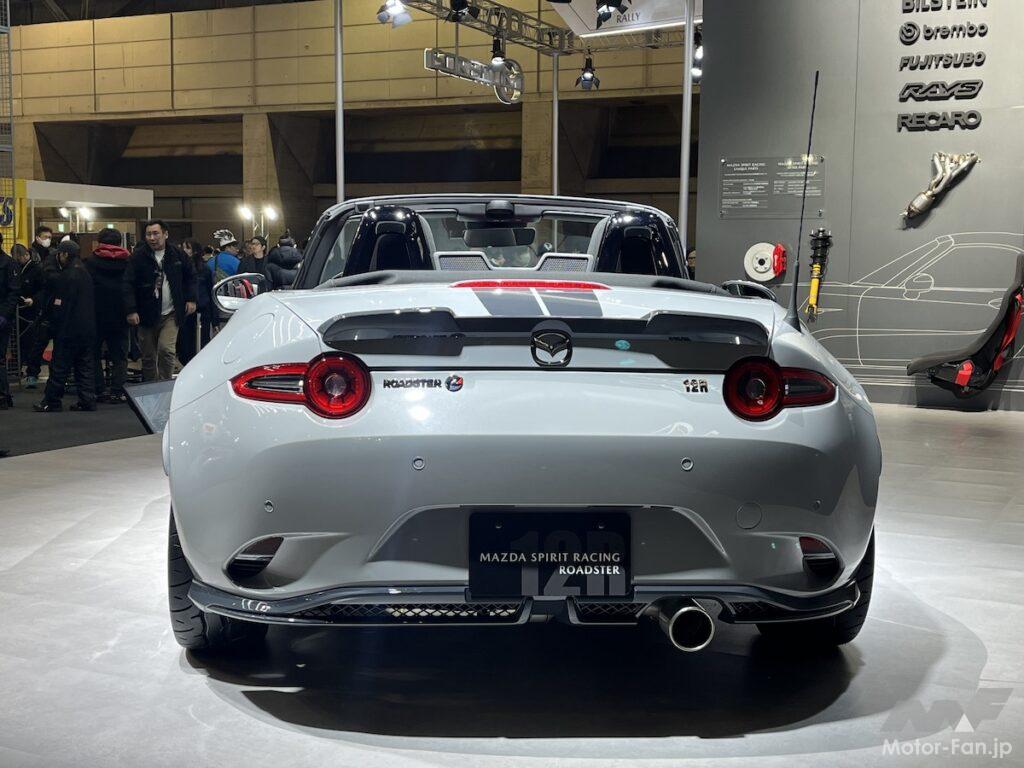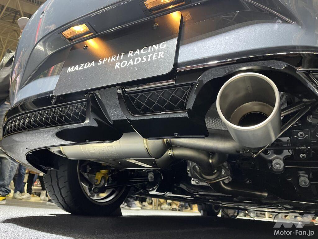 フロント同様にセンターに凹みのある特徴的なトランクリヤスポイラー。その下のエンブレムもダークメタルシルバーに変更されており、ROADSTERエンブレムの横には「MAZDA SPIRIT RACING」のロゴ、右側には「12R」のエンブレムも装着される。濃いグレー色のアンダースポイラーはセンターにフロント同様の凹みを設けることで、サーキット走行時に横風の影響を受けにくくなる。メッシュ部分はダミーではなく、本物のメッシュでエアが抜ける様になっており、本物の「レースで得られた知見」が感じられる。専用開発のチタンマフラー(フジツボ製)はシングル出しの大口径で迫力がある。