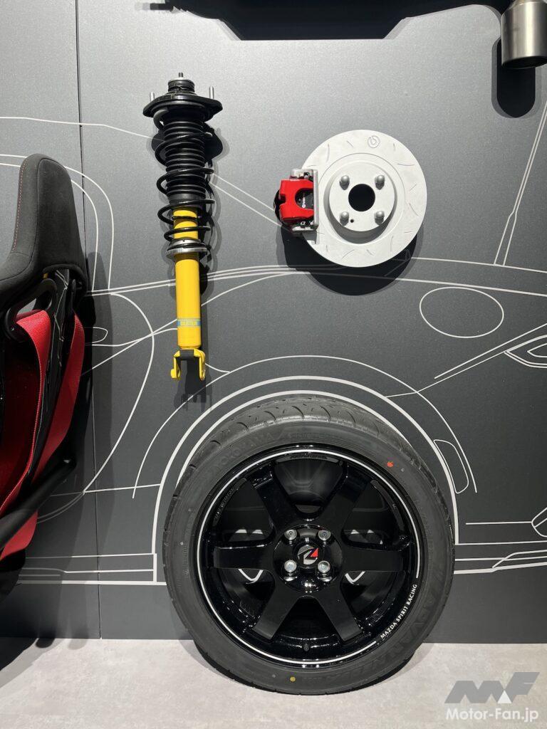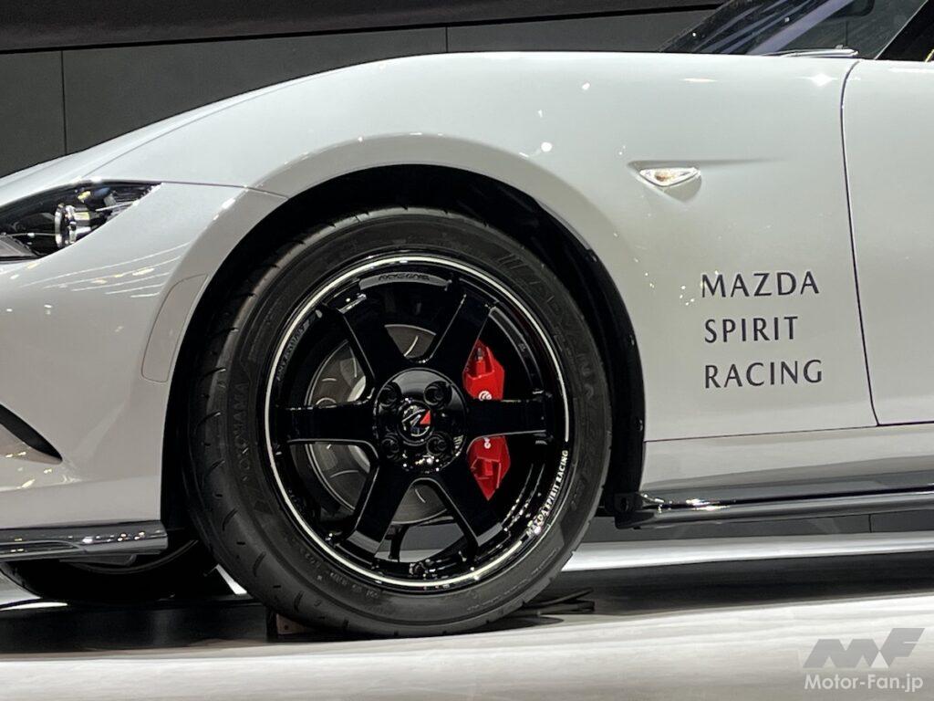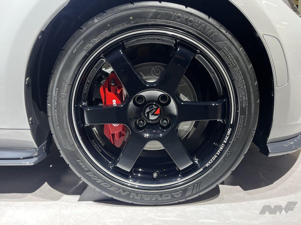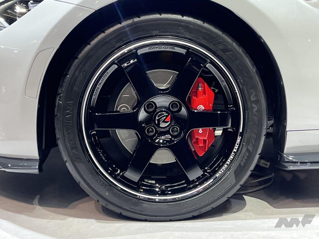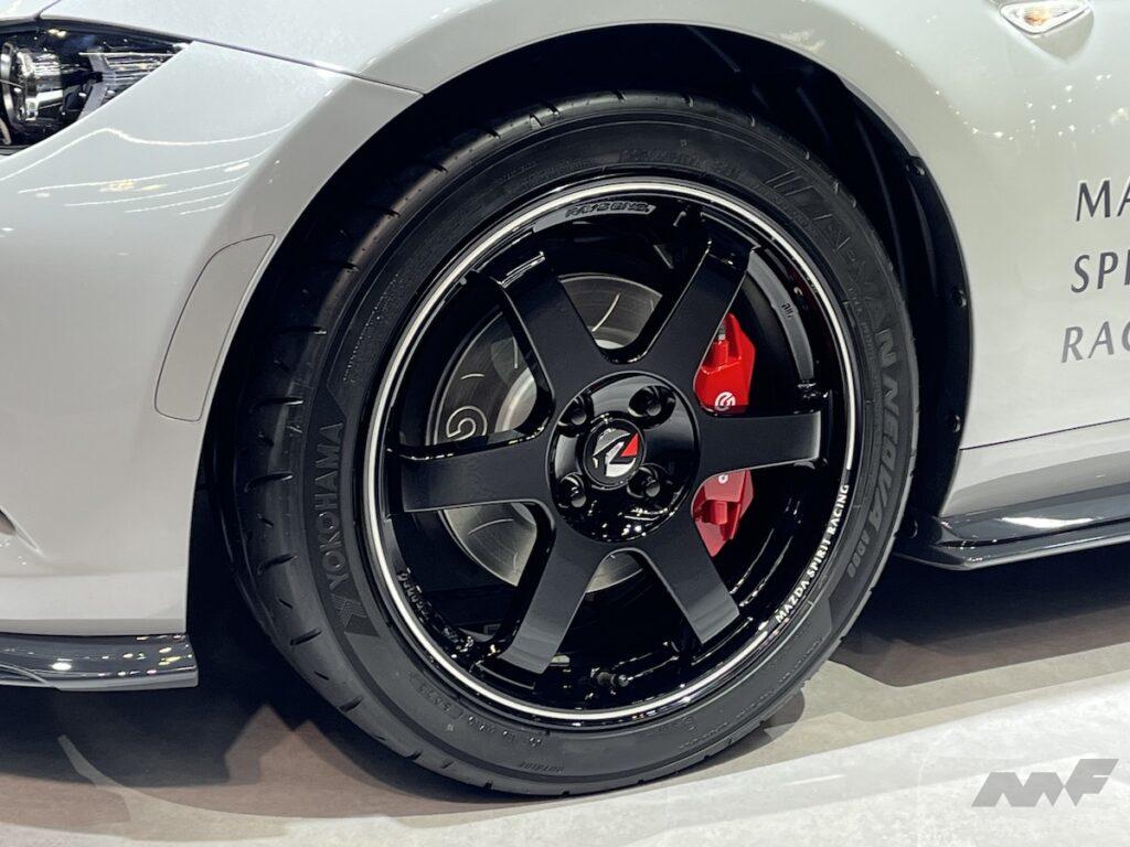 「12R」専用ホイールは鍛造のレイズ製TE37ベースでブラック色にリム切削、「MAZDA SPIRIT RACING」のロゴ切削加工、専用センターキャップも装備。タイヤは205/45R17のアドバンネオバAD09、ハイグリップタイヤを採用する。