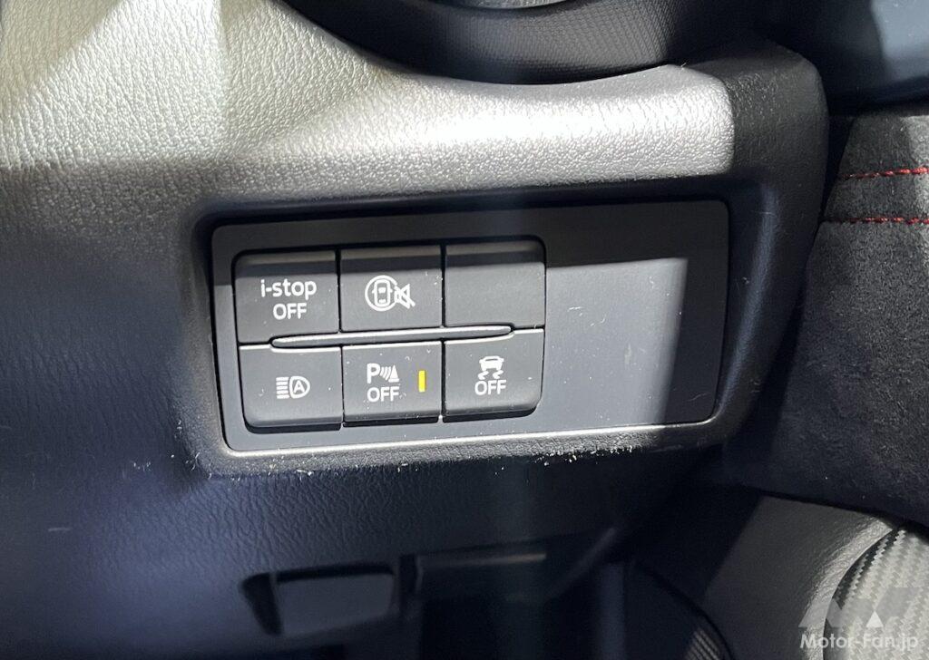 「12R」のフロントリップスポイラーはグレー色でセンターに凹みのあるデザインが特徴的でフロントバンパー中央下部には赤いセンターラインも入る。フロントグリルは艶のあるブラックの専用メッシュデザイン。少しでもフレッシュエアを取り入れるため、ACC(アダプティブ クルーズ コントロール)は装着不可というストイックさ。フロントノーズのマツダエンブレムは通常のメッキではなく、ダークメタルシルバー色へと変更されている。
