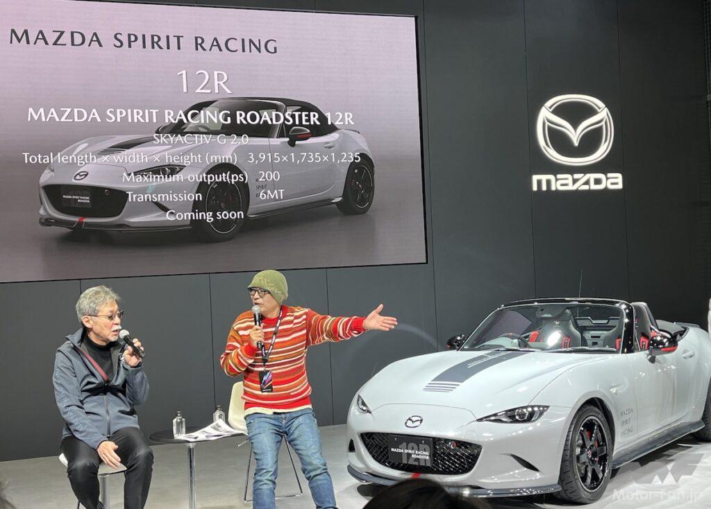 「マツダ スピリット レーシング」代表の前田育男氏(左)とピストン西沢氏(右)によるトークショーが行われ、「MAZDA SPIRIT RACING ROADSTER 12R」の話題を中心に会場は大いに盛り上がった。