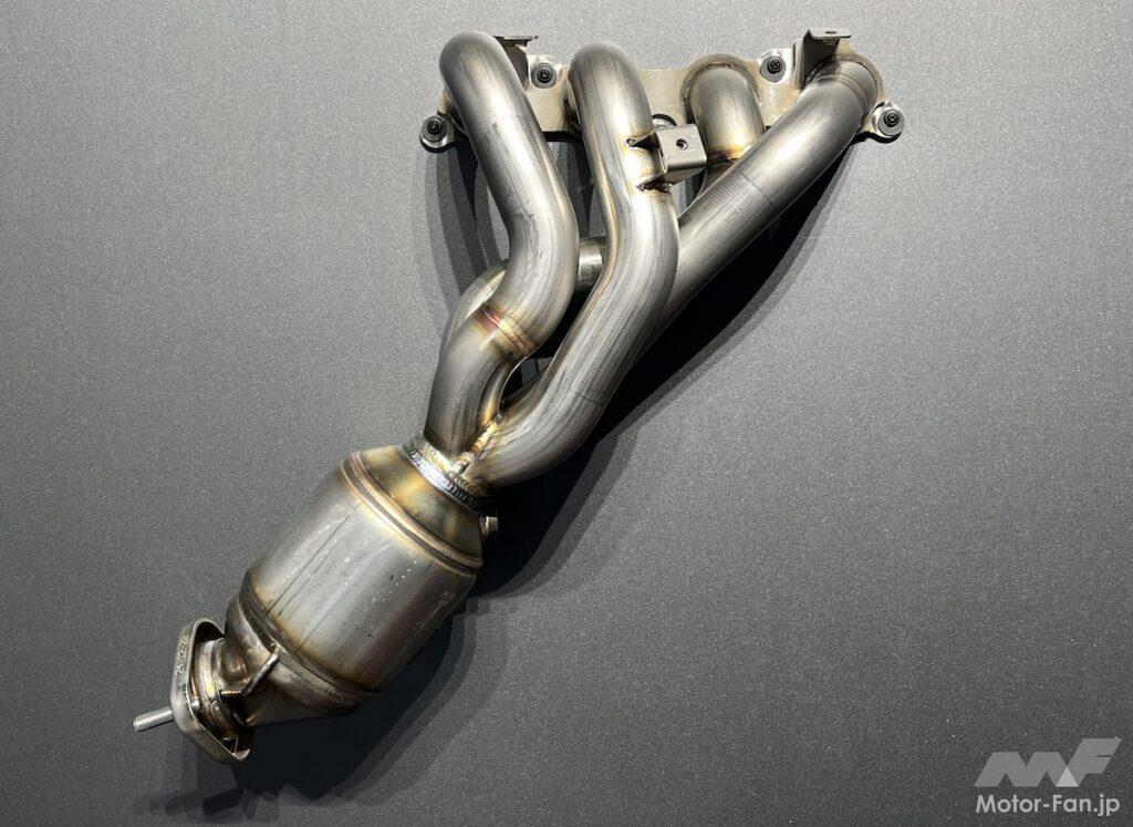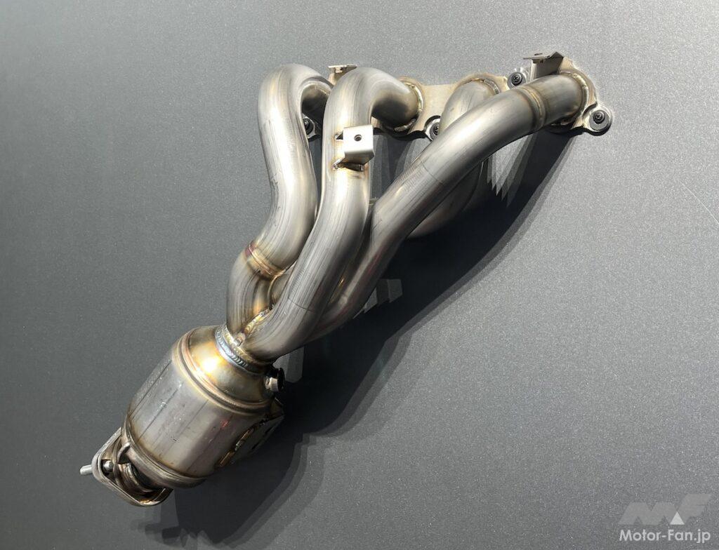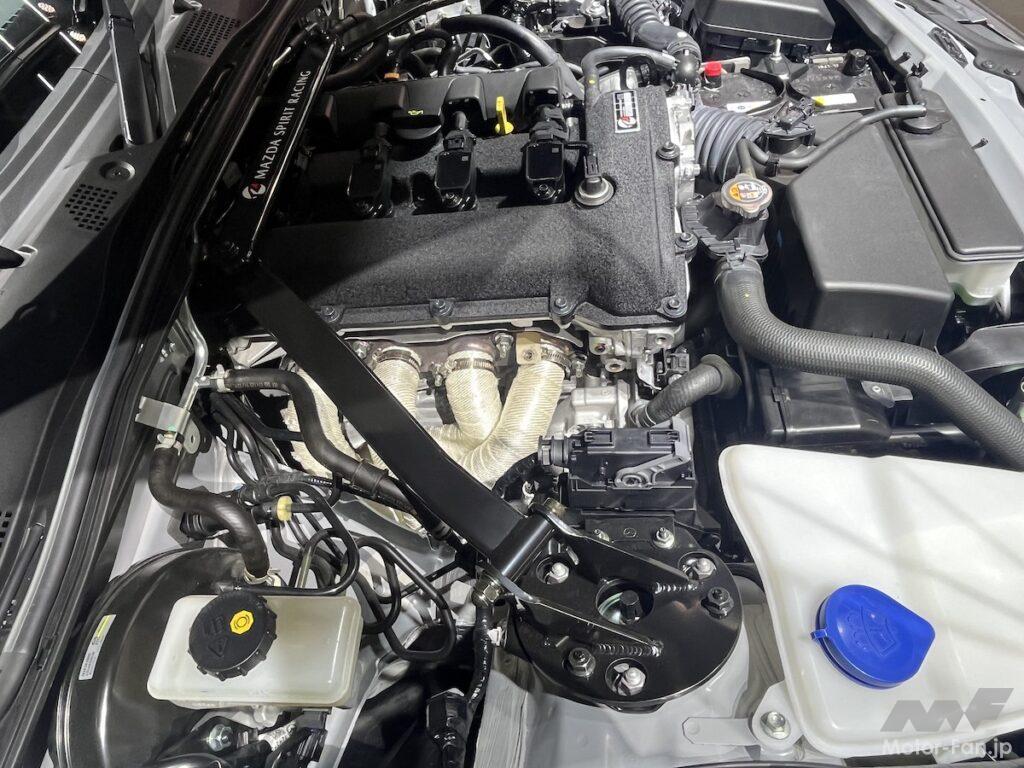 ロードスターのパワーとトルクを高めるために有効なフジツボ製専用エキゾーストマニホールドを採用。排気効率を大幅に向上させている。展示されていた市販予定の「12R」には手間がかかるが遮熱効果のあるバンテージが1本、1本丁寧に巻かれているが、これもこのままの形で販売されるという!