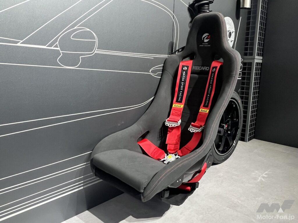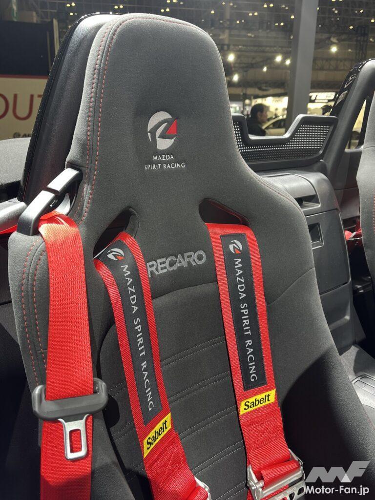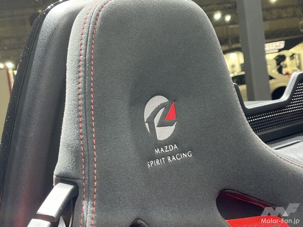 「MAZDA SPIRIT RACING」のロゴ入りのサベルト製4点式シートベルト、3点式シートベルトもレッドカラーだ。ヘッドレストには「MAZDA SPIRIT RACING」のロゴ刺繍、エンブレムも入っている。