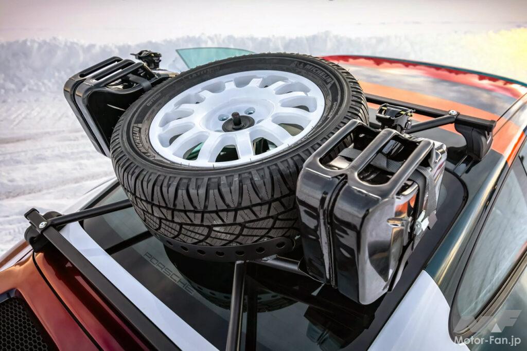 “カルマー製911ダカール”は、フロントとリヤにフレアフェンダーが追加されたほか、ダックテールスポイラーと、4つの大きなラリーライトを収納するフロントの新しいライトポッドもある。足周りでは、ミシュランのオフロードタイヤに新しいホイールも装着され、最も困難な地形にも対応できるだろう。