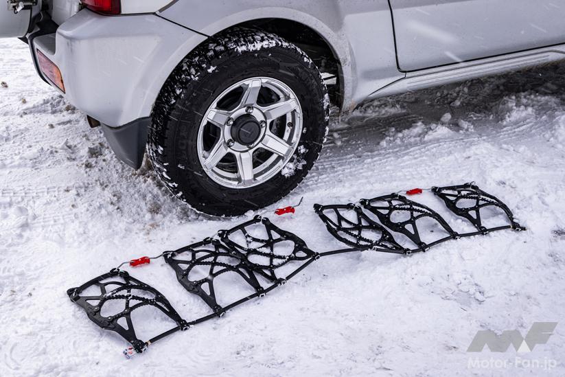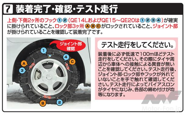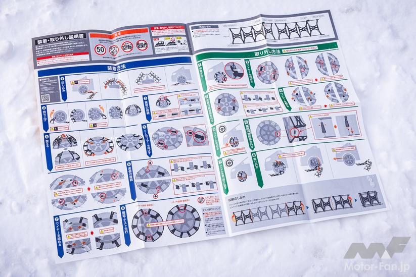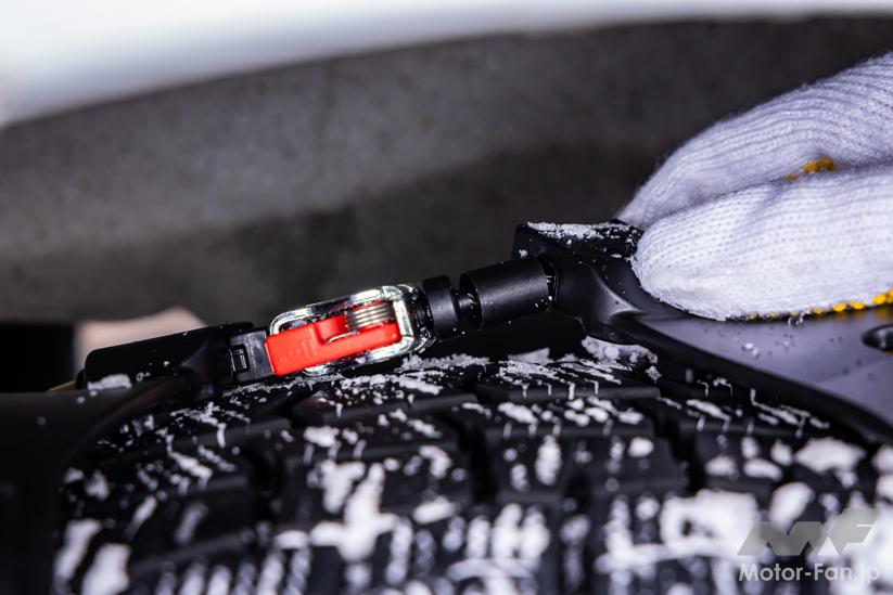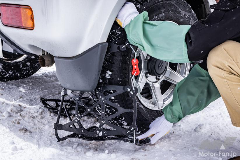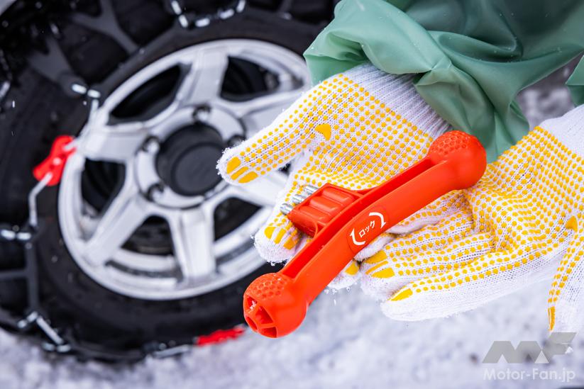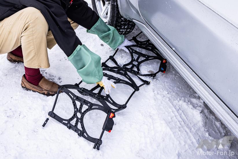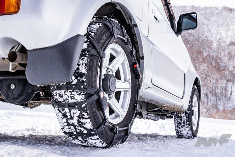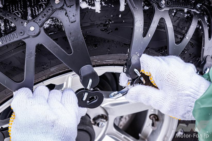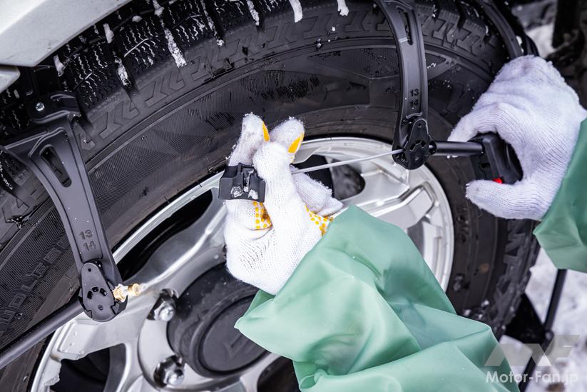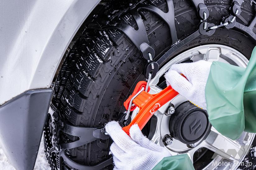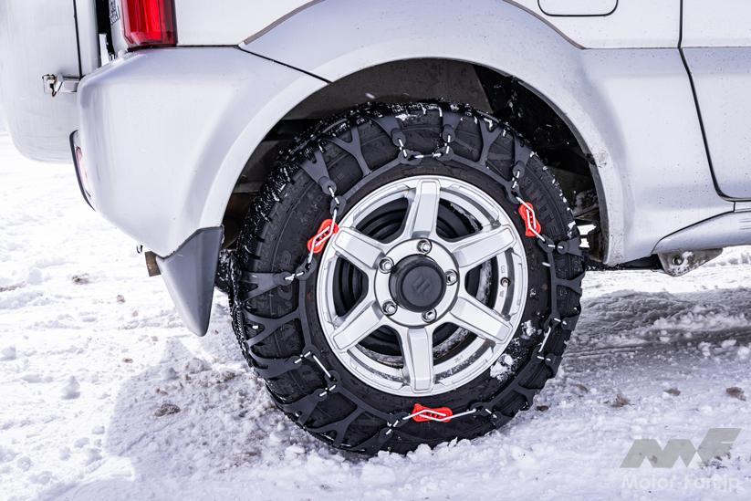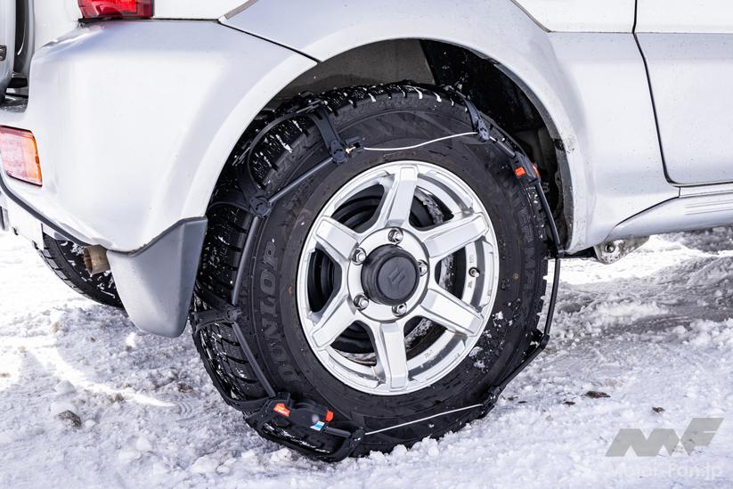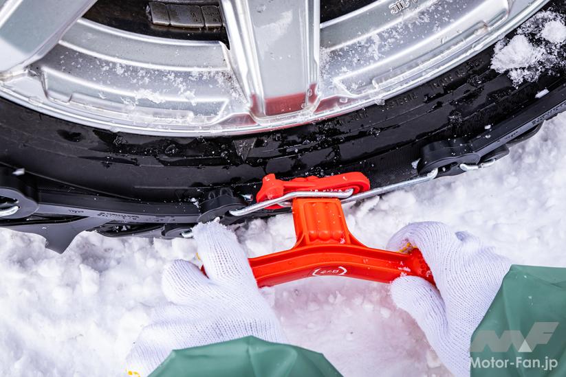 金属チェーンなり非金属チェーンなり、「新たに購入したら早めに車庫などで練習しておくこと」とはよくいわれることだが、確かにそのとおりだと思う。