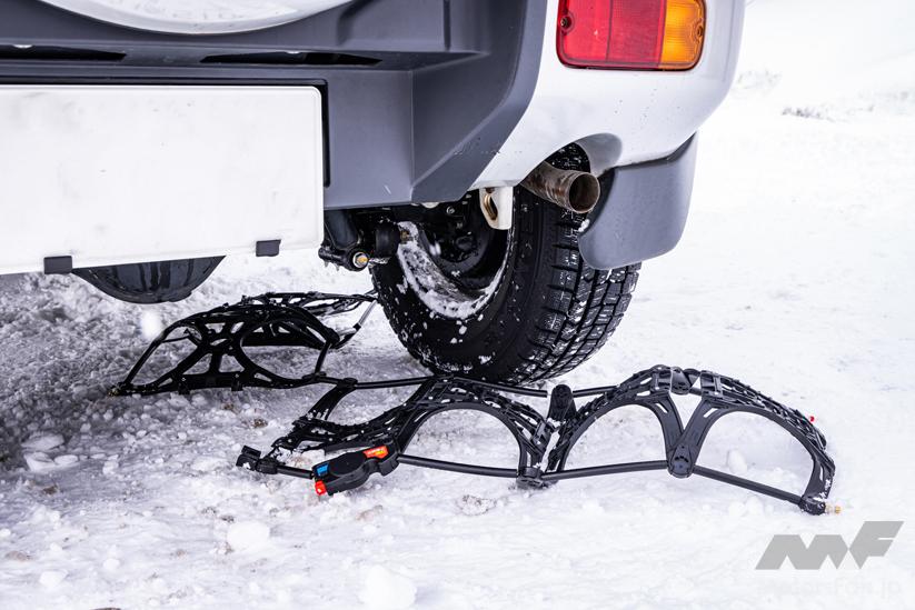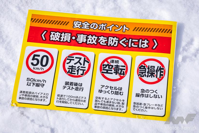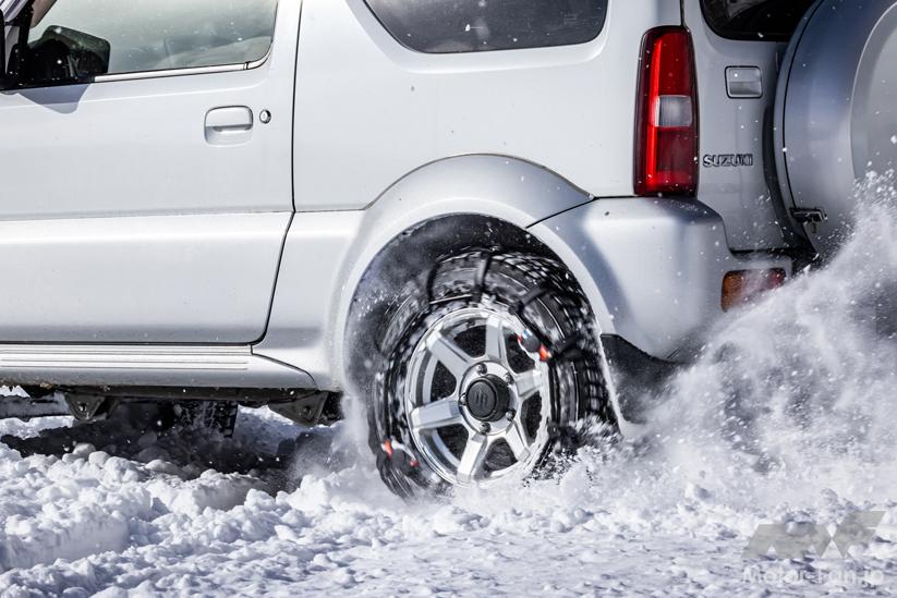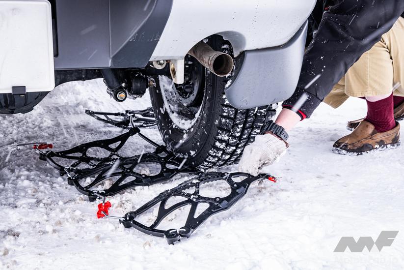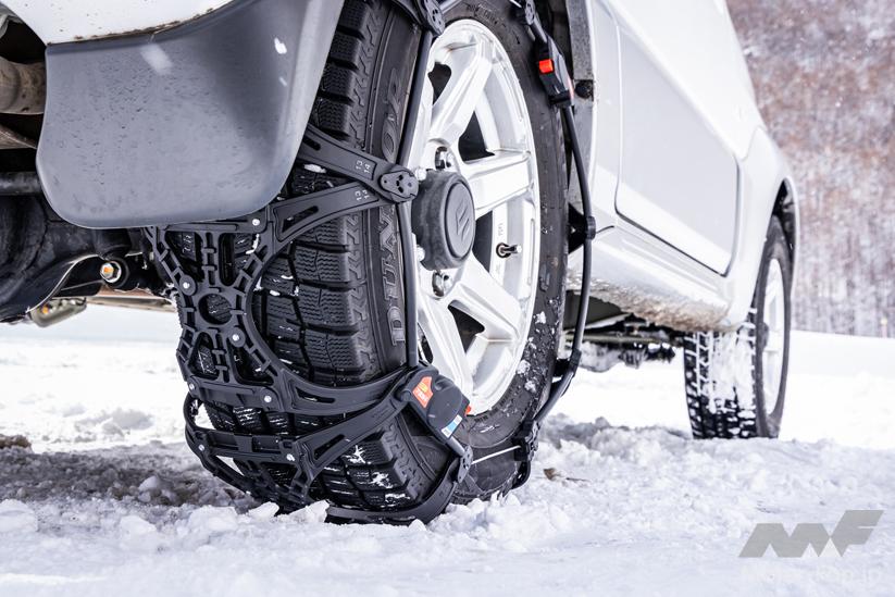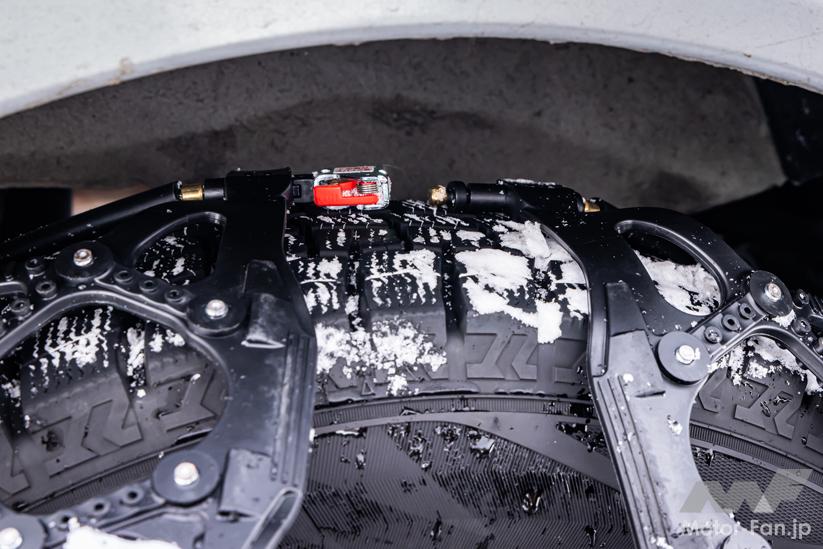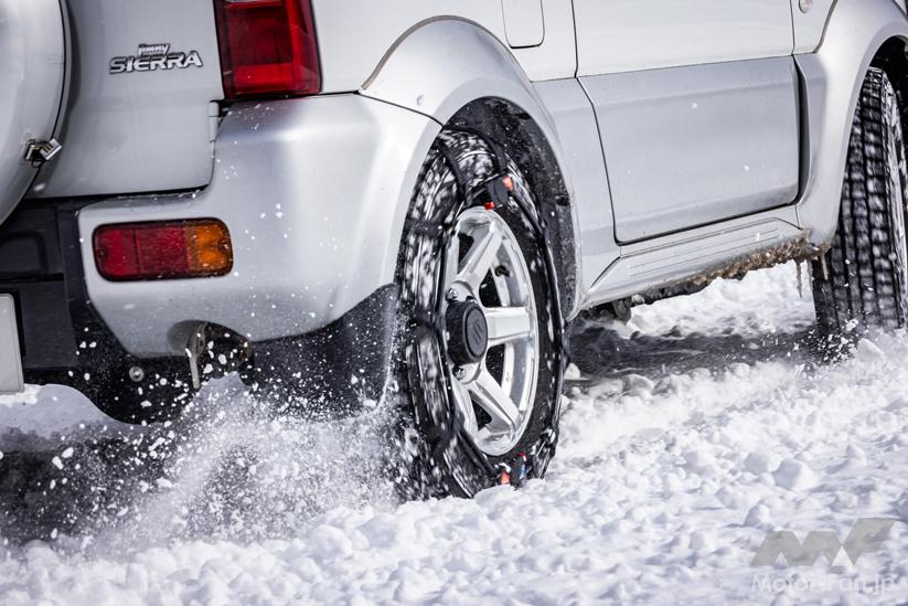 アクセルを急激に踏まない限り、リヤボディが横に振れることはないし、メーカー呼称「ディープリブ・ポリウレタンエラストマー」の名のとおり、動いている間、深いリブが雪をしっかり踏みしめているようで、接地感ならぬ掴雪感(筆者の即席造語。読み方はみなさん適当に)はスタッドレス単体のときよりも上のように思える(あくまでも感覚)。