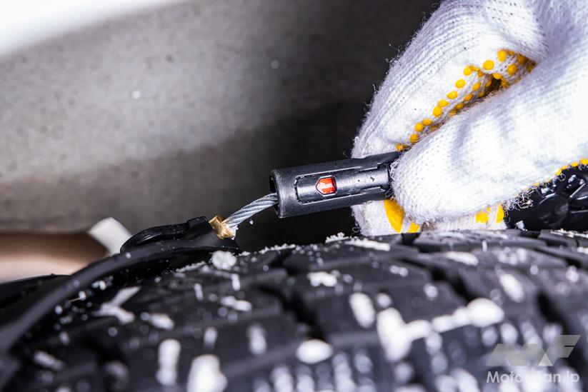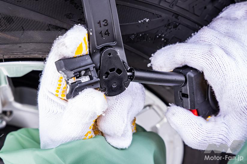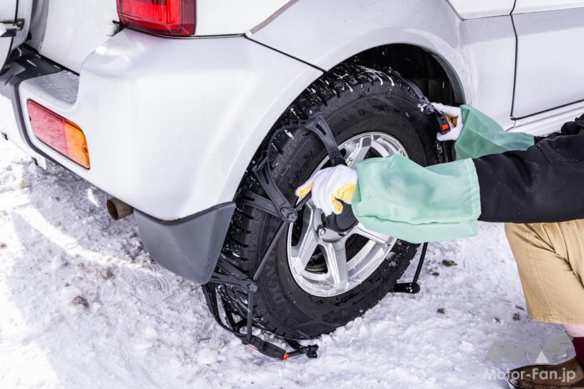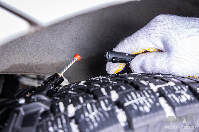 本当はFWD車の前輪に巻き、ハンドル操舵感の変化がどうなるかも確認すべきだが、車両の都合上、省略する。