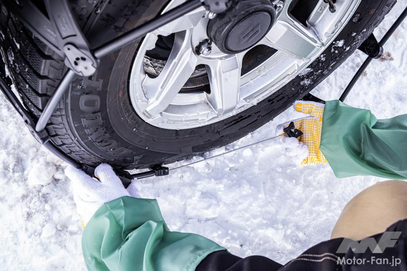 もうひとつ、乗用車のタイヤまわりの懐は思いのほか狭い。これは練習でも同じなのだが、加えて今回の場合、わずかとはいえタイヤが雪に沈んだため、雪面と車体下の距離(最低地上高)がさらに短くなっている。沈んでいなくてもアスファルトの上とは条件が違うから、クルマの床下やタイヤまわりに手が入れにくくなった。そのあたりの相違を念頭に入れておいた方がいい。