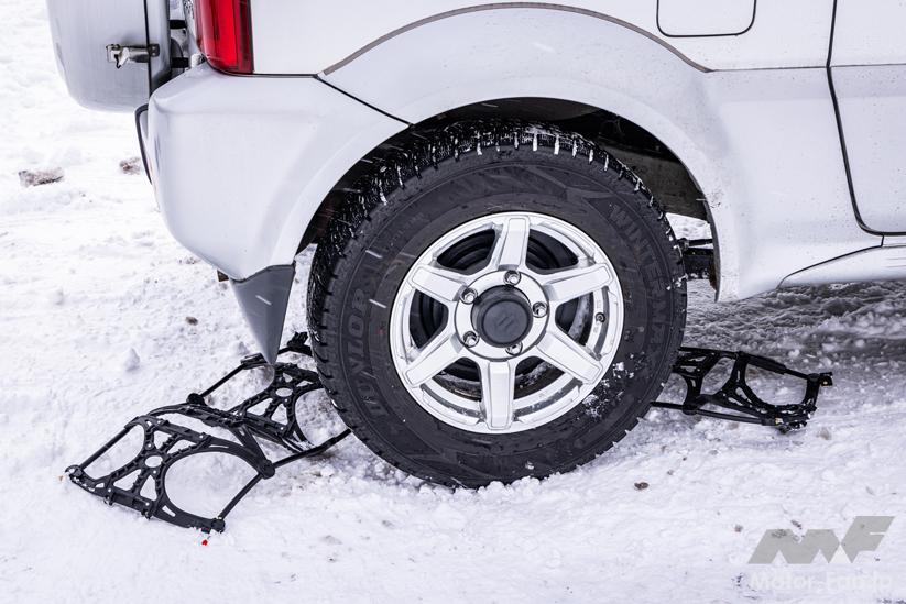 小林さんが持ち出してきた今回の撮影用非金属チェーンを仮で巻いたりタイヤ下にはさんだり……結局はどうにかのこうにかで何とか脱出したが、このハプニングでわかったことがある。