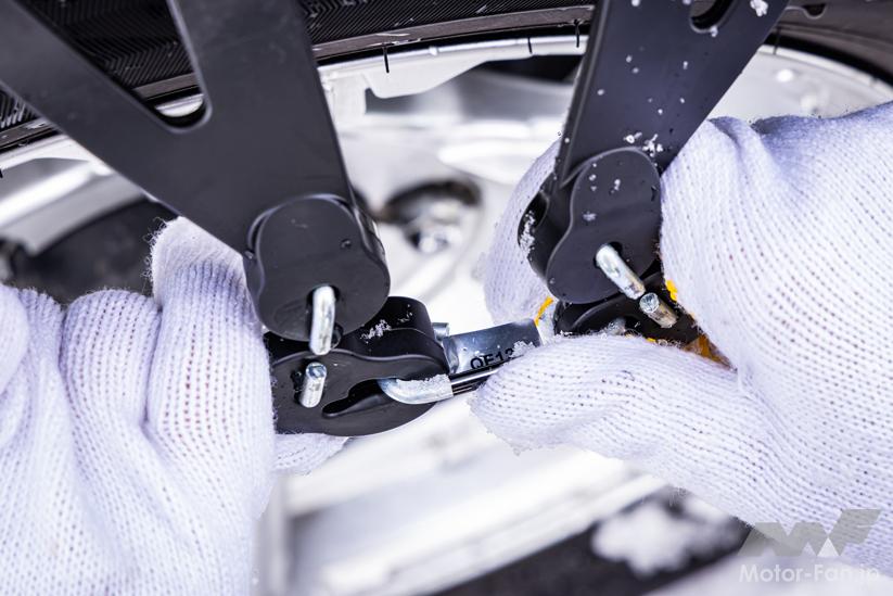 なお、「イージーフィット」の205/70R15用は、たまたま夏タイヤ用とスタッドレス用の2種あり、今回はスタッドレス用(品番EF113)をご用意いただいた。2種の違いは前編で述べた。