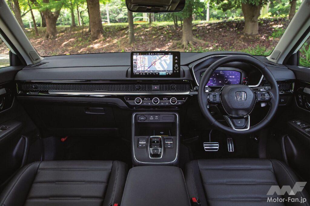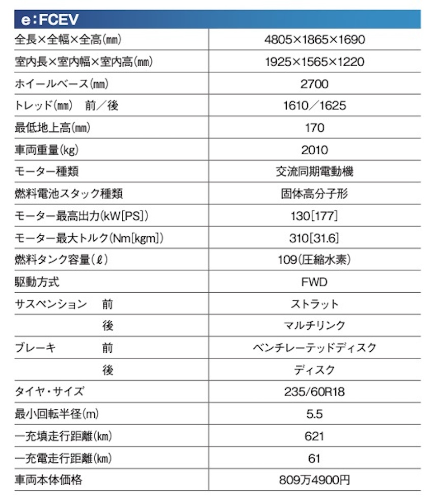 ただし6代目の現行型は従来と異なり、国内では燃料電池車のe:FCEVのみだ。2本の高圧水素タンクを搭載して、水素と酸素を反応させて電気を取り出し、モーターを駆動して走る。1回の水素充填で走行できる距離は約621㎞だ。しかもCR-Vのe:FCEVのリチウムイオン電池(17.7kWh)は普通充電もできるため、水素ステーションが近くになくても満充電で約61㎞走れるのがユニークだ。