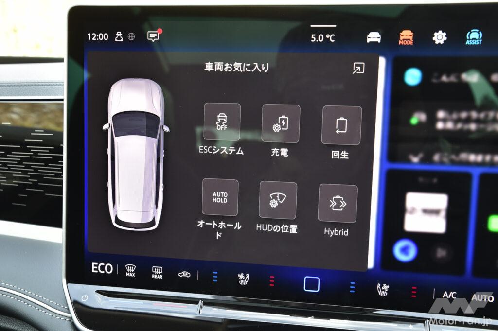 4種類あるモードのうち「スポーツ」を15インチのモニターから選ぶと、ダンピングはもちろんパワーユニットや電動パワステが安定方向に協調制御され、各閾値が上がる。それまで影を潜めていたエンジンが存在感を高め、アクセル開度に応じてターボとモーター両方のブーストを効かせる。
