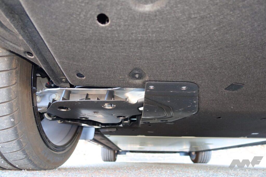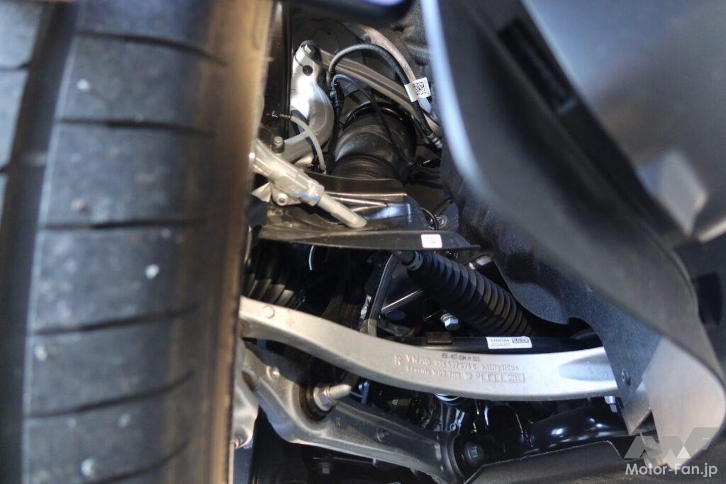 BEVにとって航続距離を左右する空気抵抗係数は重要で、新型マカンのCd値は0.25。床下を覗き込んでみたら、見事なまでにフラットだった。リヤサスペンションのロワーリンク底面にはカバーが装着され、フロントはタイロッド部に空気の流れをガイドする機能を持たせていると思しきパネルが設置されている。ヘッドライトユニットの下にはエアカーテンのインレットが設けられており、フロントホイールハウスに空気を導き、このエリアの空気の流れを制御する。