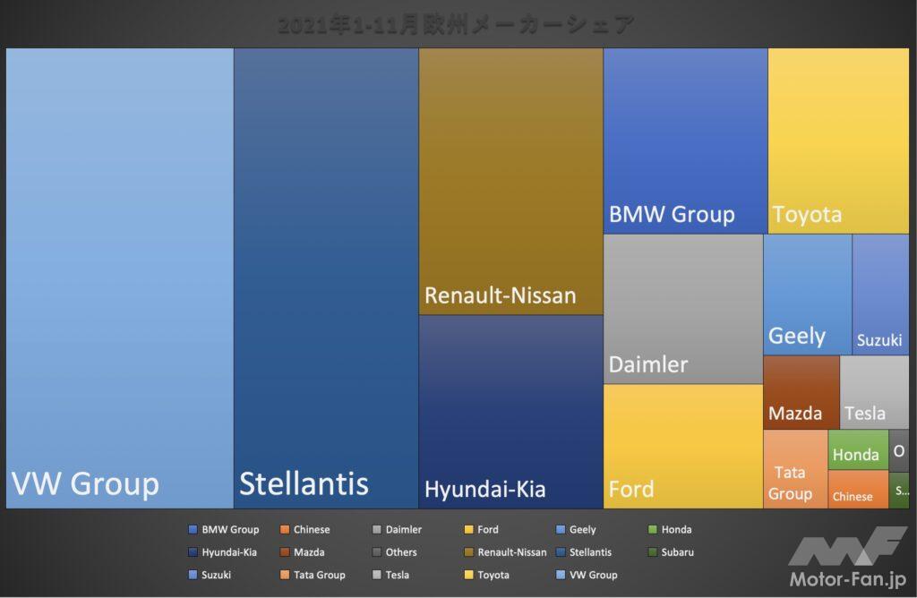 2021年1~11月の欧州自動車販売台数のデータを見ると、欧州25カ国で売れた新車は1060万7461台で前年同時期比で±0%、つまり2020年度同水準だった。