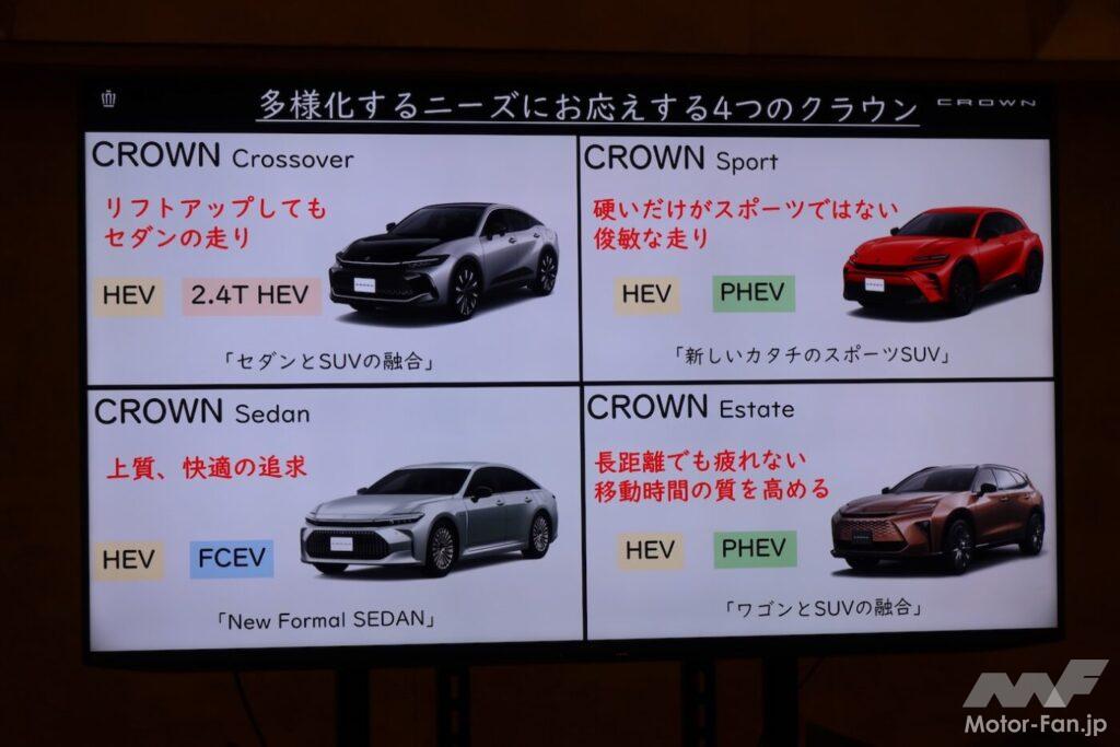 つまり、「クラウンに乗りたい」「そろそろクラウン」と思ってディーラーに行けば、これだけのバリエーションのなかから好みのクラウンを選べるということだ。これが「群」で戦うクラウンということなのだろう。実際、クラウンオーナーの平均年齢は劇的に若返り、ディーラーで実物を見て試乗した結果、当初の目論見と違う車型を選ぶ人も続出しているという。