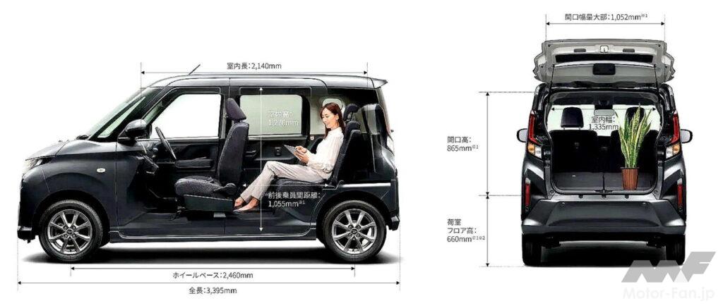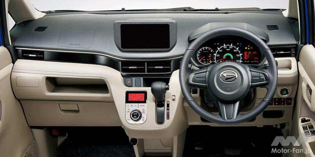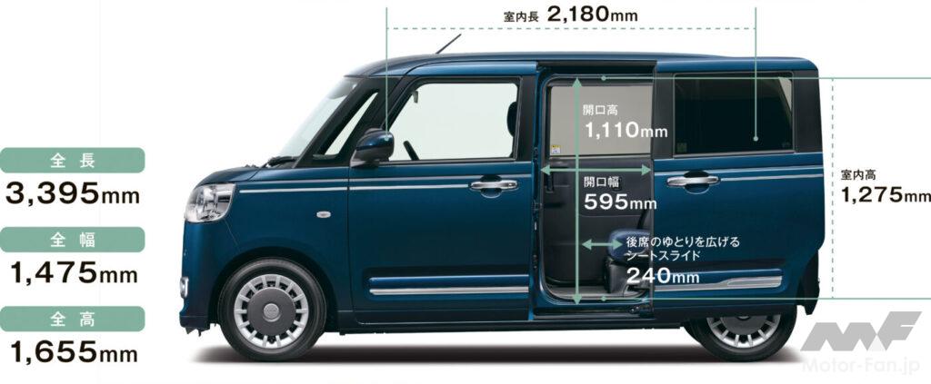 新型ムーヴは全長、全幅、全高およびホイールベースがムーヴキャンバスと同一寸法となっている点に注目したい。これらは旧型よりも若干拡大されており、居住性と安定性が強化されていることを示す。