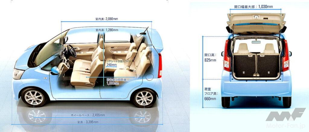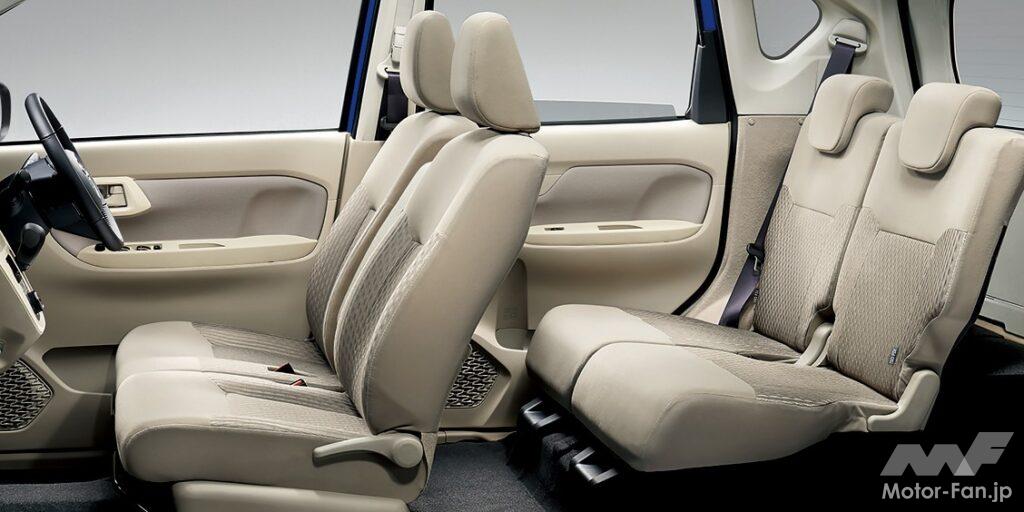 特に、全長と全幅は変わらないものの、ホイールベースが旧型よりわずか5mm延長されただけにもかかわらず、室内長+60mm、室内幅+15mmと、室内空間の拡張に一役買っている。これにより、後席の足元スペースや横方向の余裕が増し、大人4人でフル乗車した際でも圧迫感は旧型より少なくなっている。もっとも実質的な姉妹車と言えるムーヴキャンバスと比べると、室内長-40mm、室内幅-10mm、室内高-5mmとなっており、ミニバン的キャラクターのムーヴキャンバスとの差別化が見られる点だろう。