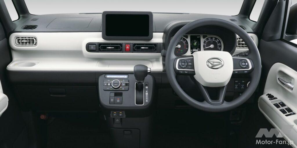 内装も水平基調のインパネで広さと見晴らしを重視。加えて、ピアノブラック調やマット素材などを組み合わせた質感の高い仕上げは、旧型ムーヴのシンプルな造形と比べて明確な上質化が図られている。