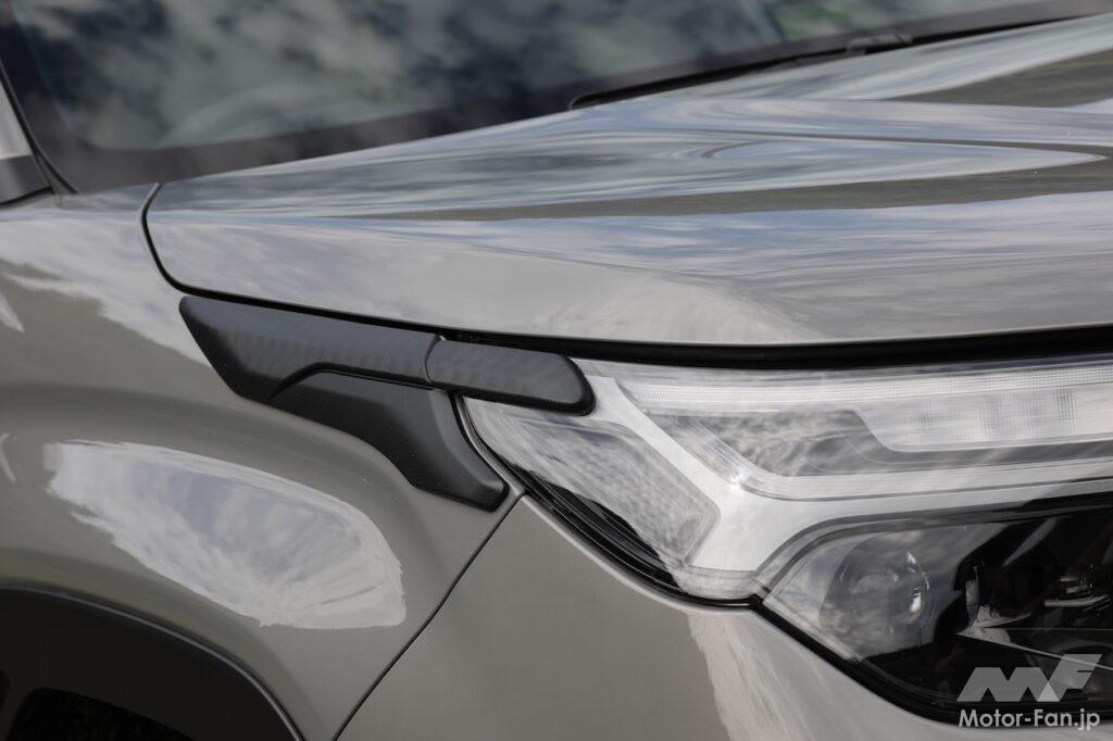 ボディサイドプロテクターもランプサイドプロテクターも、マウンテンバイクやロードバイクの立て掛けを想定してものだ。アクセサリー開発メンバーの実体験が反映されているのだそう。ルーフラックからロードバイクを降ろしたときに、地面に横倒しにして置いたり、ボディに立て掛けたりしていたという。ところが、前者の場合はロードバイクへの傷つけが気になるし、後者の場合はクルマへ傷つけが気になる。そこで、ボディサイドプロテクターにロードバイクのハンドルを引っかけておけるようなくぼみを設け、ロードバイク(あるいはマウンテンバイク)を安心して立て掛けられるようにした。