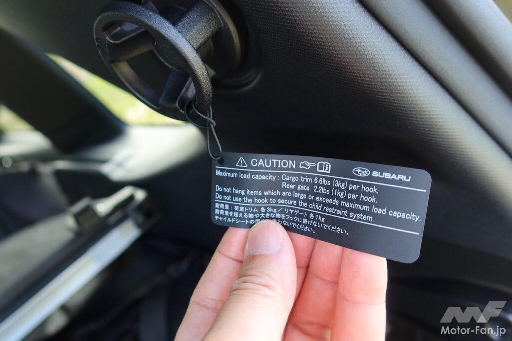 このフック、樹脂の内装パネルに荷重を受け持たせる構造ではない。車体側、つまり鋼板に溶接したナットに取り付ける構造となっている。「新型フォレスターでは、車体の設計がある程度決まってから用品を決めるのではなく、車体の設計構想段階から用品のコンセプトを考え、設計に織り込んでいます」と開発メンバーのひとりは説明。「安全を考慮して」耐荷重は3kgに設定されているが、相当頑丈な作りとなっている。ちなみに、ユーティリティフックのコーションラベルもデザインにこだわったそう(スペック記述面より、SUBARUのロゴがある表面がしゃれている)。