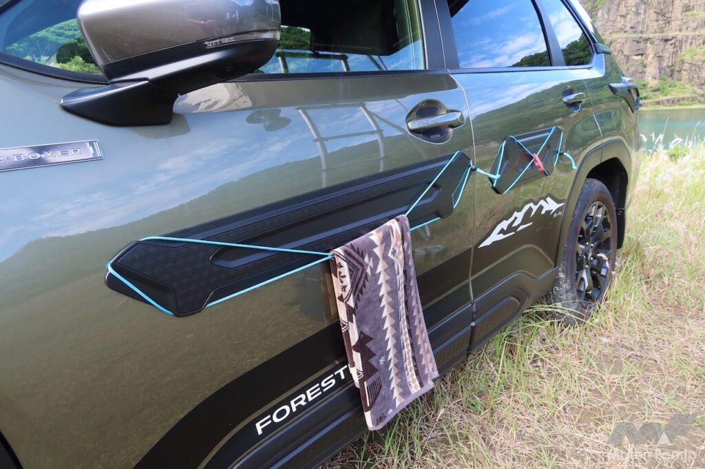 フロントとリヤのランプからボディサイドに回り込む部分に装着する硬質ゴム製のランプサイドプロテクターは、新型フォレスターから導入したアイテム。マウンテンバイクやロードバイクを立て掛ける際の保護としての役割を想定すると同時に、立て掛けやすさにも配慮した形状にしているという(硬質ゴム製なので、そもそも滑りにくい)。スキー板やスノーボード、あるいは釣り竿を立て掛けるのにも便利だ。