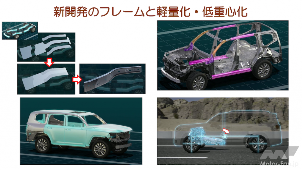 伝統のラダーフレームを刷新し、TNGAの考え方を生かした新しいGA-Fプラットフォームを採用した。このGA-Fプラットフォームは、もちろんフレーム構造を使う。最新の溶接技術などを使うことで、高剛性(従来型比+20%)、衝突安全性能、静粛性、走りの質を上げながら、フレーム単体で35~40kgも軽量化している。
