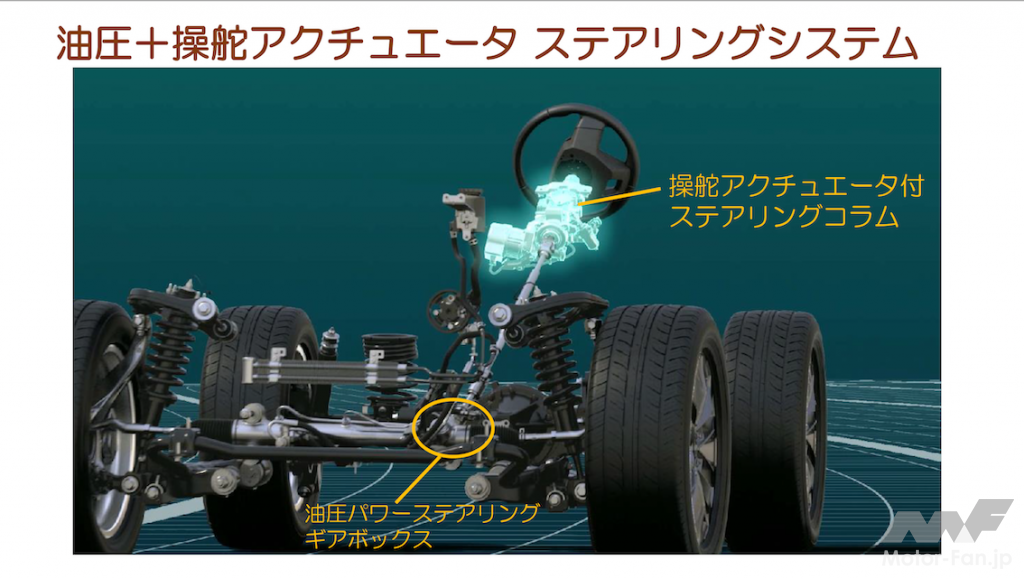 パワーステアリングは、過酷な環境下での使用に耐える油圧式パワーステアリングを採用。これに電動式の操舵アクチュエーターを組み合わせている。この電動式操舵アクチュエーターとは、つまりコラム式電動パワーステアリングのことだ。コンパクトカーが採用することが多い、電動コラムアシストを追加することでレーントレーシングアシストなどの操舵支援機能を追加することが可能になった。低速時の優れた取り回しや悪路走行時のショック(キックバック)を低減、よりすっきりしたステアリングフィールなども併せて実現したという(ZX、GR SPORT、VXに標準装備)。