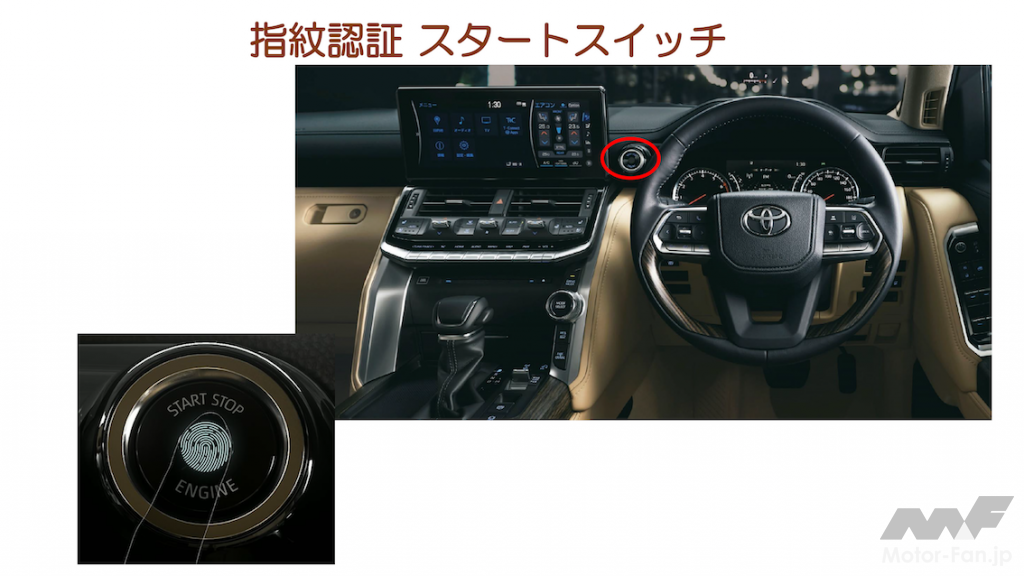 世界的な人気を誇るランドクルーザーには、もっとも盗難犯に狙われるという負の側面もある。新型ランドクルーザーでは、スタートスイッチ中央に指紋センサーを採用。スマートキーを携帯し、ブレーキを踏みながら スタートスイッチ上の指紋センサーにタッチすると、車両に登録された指紋情報と照合、指紋情報が 一致しなければエンジンが始動しないセキュリティ機構を採用した(ZX、GR SPORT、VX、AXに標準装備、GXにオプション)。