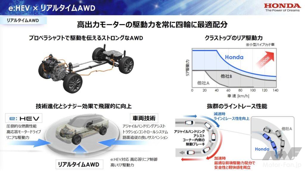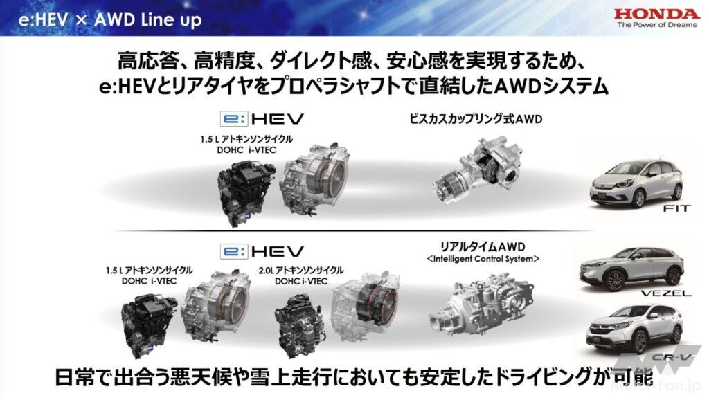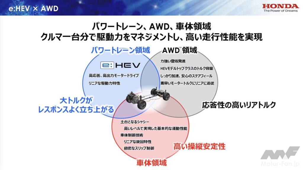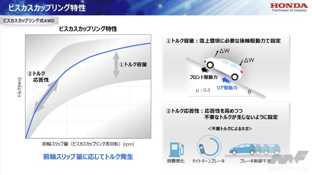 e:HEVは高速域の一部の状況を除いて、基本的にはモーターで走る。エンジンではなくモーターと組み合わせたことで、ビスカスカップリングの持ち味が息を吹き返したようだ。前述したように、この方式は前輪がスリップすることで後輪に駆動力が伝わるのだが、前輪の駆動力を緻密に制御できるモーターを得たおかげで前輪のスリップ量を最適に制御できるようになり、リヤの駆動力を安定して発生させることができるようになった。