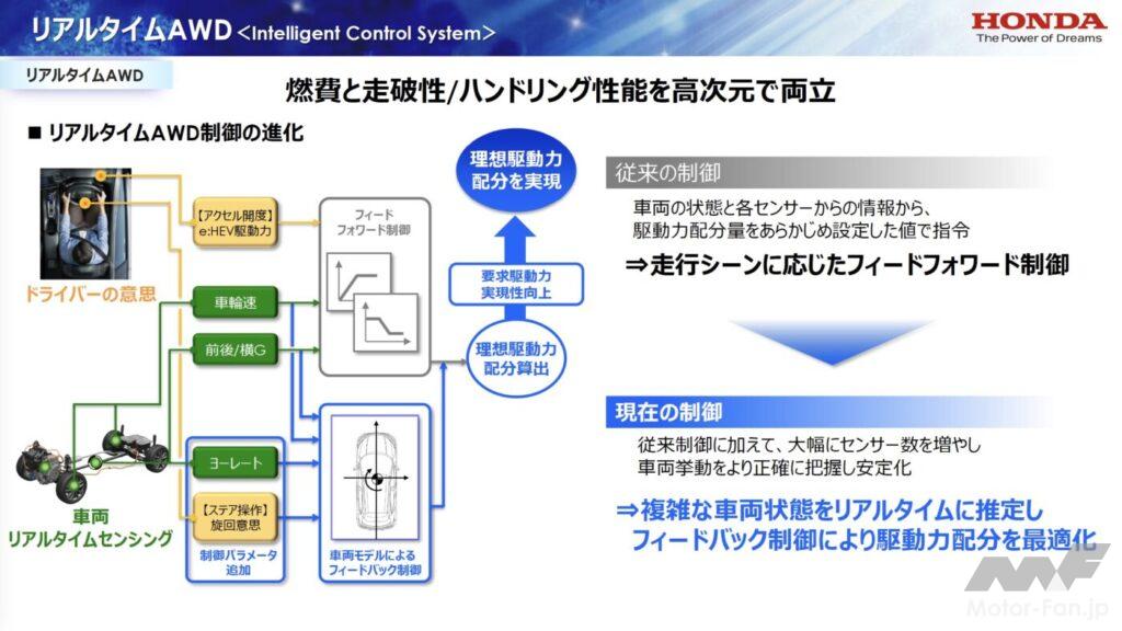タイムラグなく四輪で駆動し、力強い加速を披露するのがリアルタイムAWDの特徴。発進時から、リヤに駆動力を伝達している(そのため、ドライ路面でもFF仕様より安定している)。従来制御では加速度によって変化する前後の荷重配分に合わせてリヤへの配分量を割り当てるフィードフォワード制御を行なっていた。2018年のCR-Vの発売に合わせてフィードバック制御を加えた新しい世代に進化している。ドライバーのステアリング操作やヨーレートから旋回状態を推定し、アンダーステア傾向の場合はフィードフォーワード分が足りないと判断してリヤの配分量を増やす制御を採用している。オーバーステアの場合はその逆で、要するに、ドライバーが思い描いたラインをトレースする方向だ。