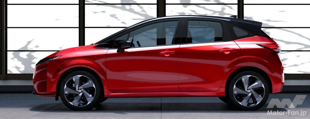 オーラはボディサイドに前後を貫くキャラクターライン(折り目)が形作られているのが特徴で、コンパクトな2ボックスボディの中に、落ち着きある優雅なスタイルを表現している。対するノートはオーラとフロントドアまで同じラインをリヤドアから徐々に持ち上げ、リヤドア後端で一度角度を変えてさらに上向きとして、シックスライトウインドウの後端で合流する。いわゆる前傾姿勢に貢献する形で、コンパクトハッチの機敏な機動性や扱いやすさなどを表現したい造形だ。