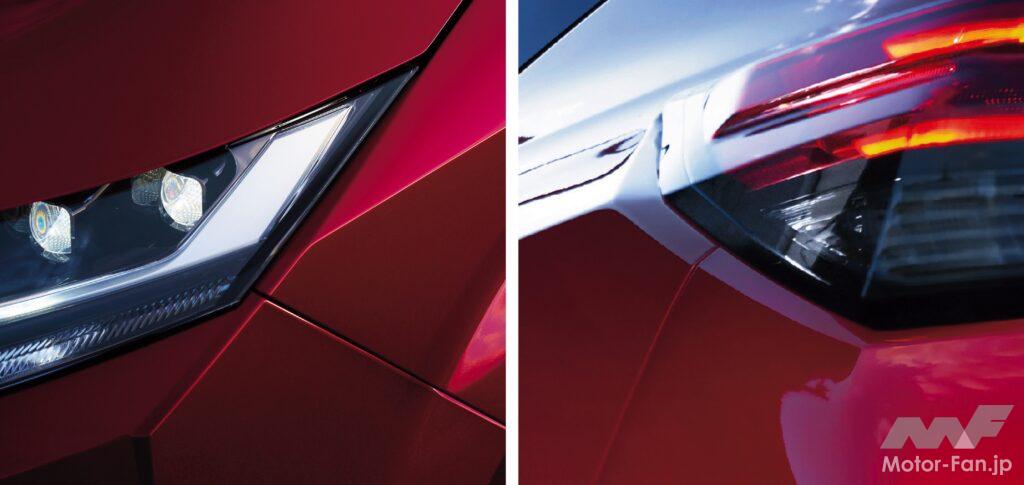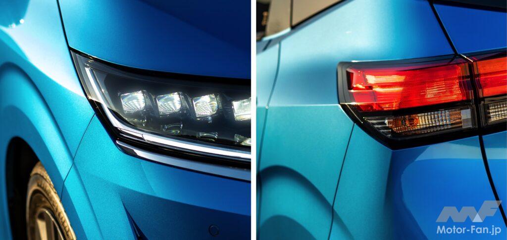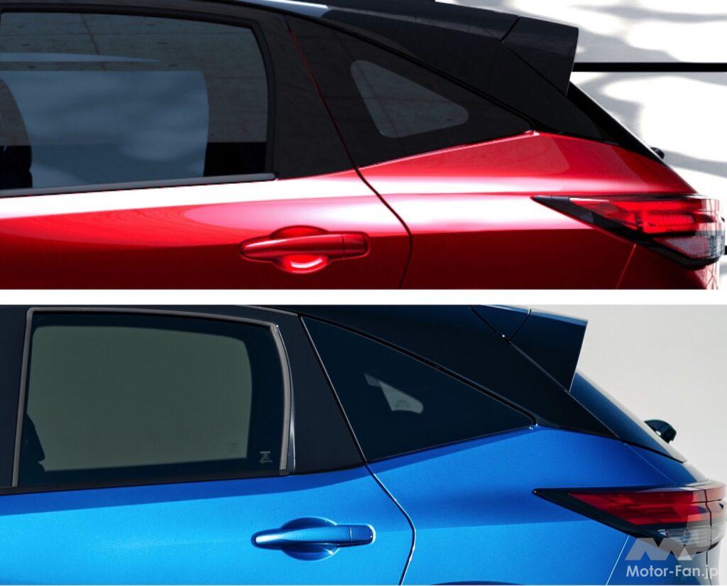 フェンダーの張り出しは、一見すると全くわからないのだがヘッドライトとリヤコンビランプのマウントされた部分をみるとその違いがわかる。オーラでは明確な段差がつけられて、より張り出したフェンダーの存在感がわかる。この段差のラインがフロントではグリル周りに続くシャープな縁取りとなり、細いヘッドランプと同様にクールな印象を強めている。リヤはここから安定感あるバンパーを造形できている。