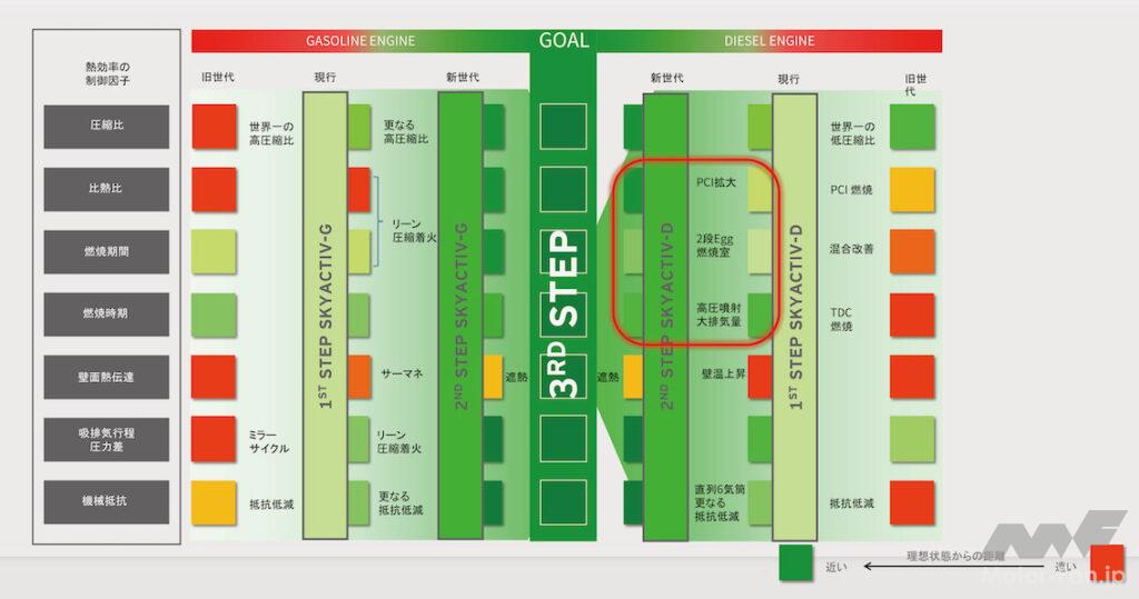 MF:いつものだんだん理想の燃焼に近づいているっていう図があります(上図)。今回ディーゼルが第2ステップになりました。ガソリンも次のステップがあって、その次が理想ですね。だいぶ近づいていますね。