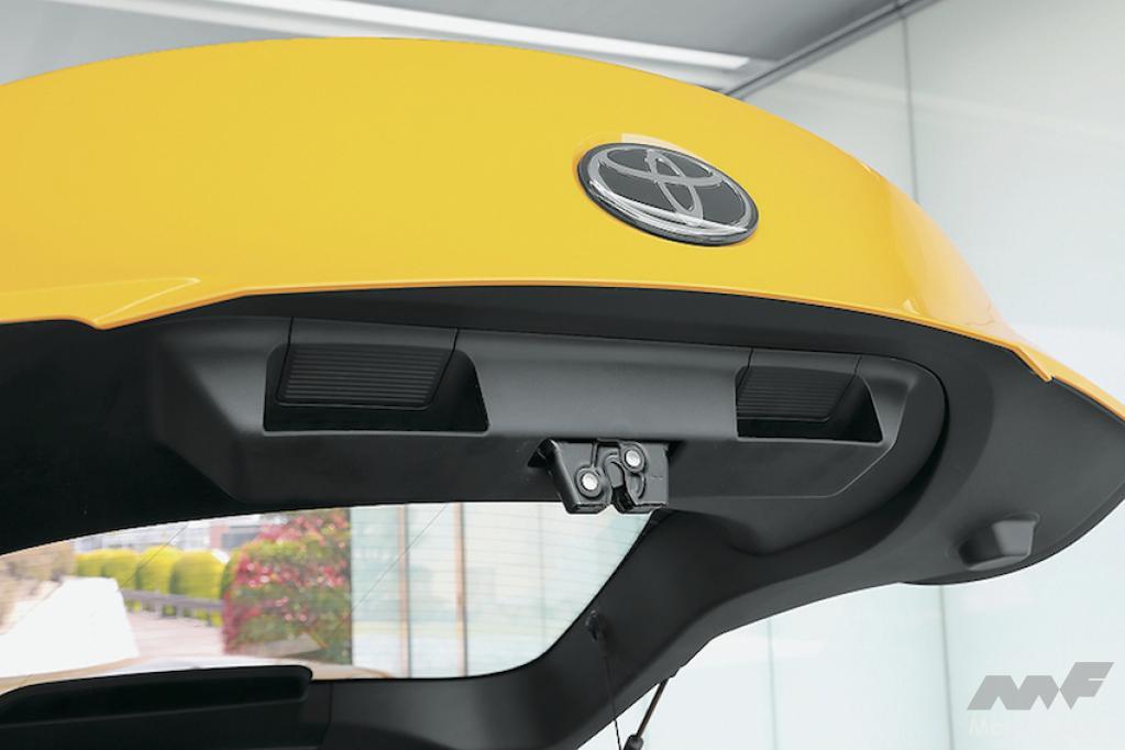 〈キーはトヨタエンブレム付き〉トヨタ車としては珍しい形状の非接触式キー。一番下のひし形マークは、長押しで一定時間ヘッドライトが点灯する。