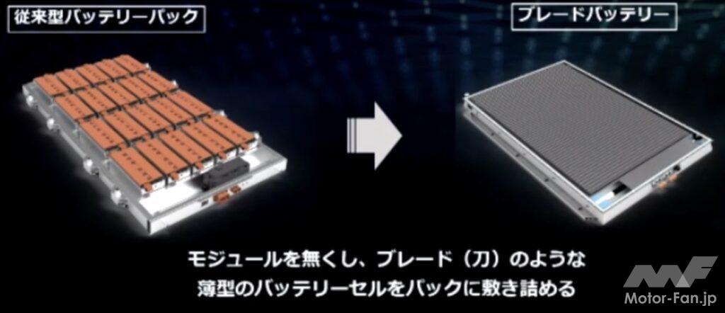 その結果、ブレードバッテリーはバッテリーパックの空間利用率を従来比約50%高め、エネルギー密度を向上させることに成功した。