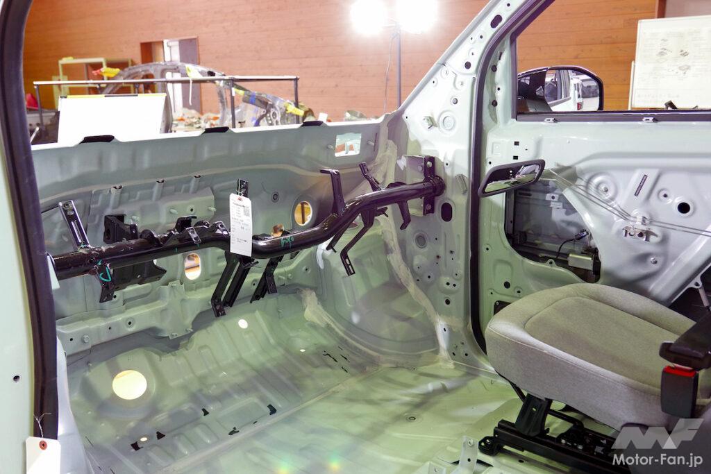 RRという駆動系配置のため車体前方に重たいICE+変速機がなく、衝突時にICE+変速機が車室方向に突進してくることがないため、ボディ側の前面衝突対策は楽になる。「宏光MINI」では、バルクヘッド(車室隔壁)の乗員ひざの高さ付近に横方向の補強材(クロスメンバー)が1本入っているだけだ。ボディはほとんどの部位が軟鋼製であり、せいぜい引っ張り強度590MPa級ではないだろうか。