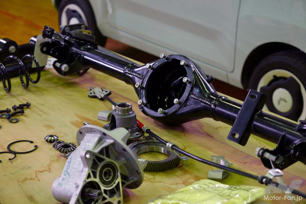 「宏光MINI」は全長2920mm×全幅1493mm×全高1621mm、ホイールベース1940mm。三洋貿易が購入し分解した「マカロン」仕様は電池搭載量の多い上級仕様なので車両重量は約700kg。このサイズのクルマだと、日本のメーカーならFF(フロントエンジン・フロント)を選ぶだろう。しかし「宏光MINI」は後軸と平行に電動モーターを置き、同社の商用車シリーズ同様のリジッド(固定)アクスル式後輪駆動、RR(リヤエンジン・リヤドライブ)だ。