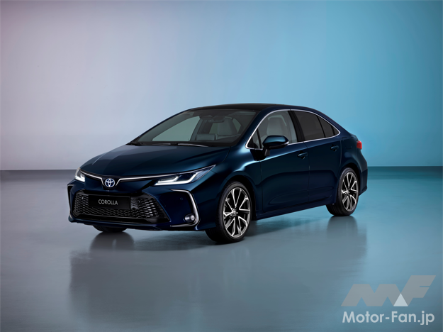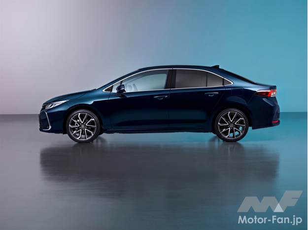 新型カローラ・セダンのフェイスは先代よりもスタイリッシュな印象を見せる。メッシュパターンのフロントグリルは横に広く設計され、その外側にはU字のベゼルに囲われたフォグランプが。シルバーのベゼルがフェイス中央からヘッドライトに向かって流れるように配置され、疾走感を演出している。あくまでもボディカラーを主体とするシンプルかつ清潔感のあるボディに仕上げられている。