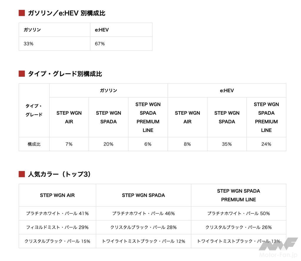 評価ポイントを裏付けるように、パワートレインは67%が「e:HEV」を選択。グレードの人気比率は、e:HEV仕様車が多い順にSPADA(35%)、SPADAプレミアムライン(24%)、AIR(8%)、ガソリン車がSPADA(20%)、AIR(7%)、SPADAプレミアムライン(6%)。