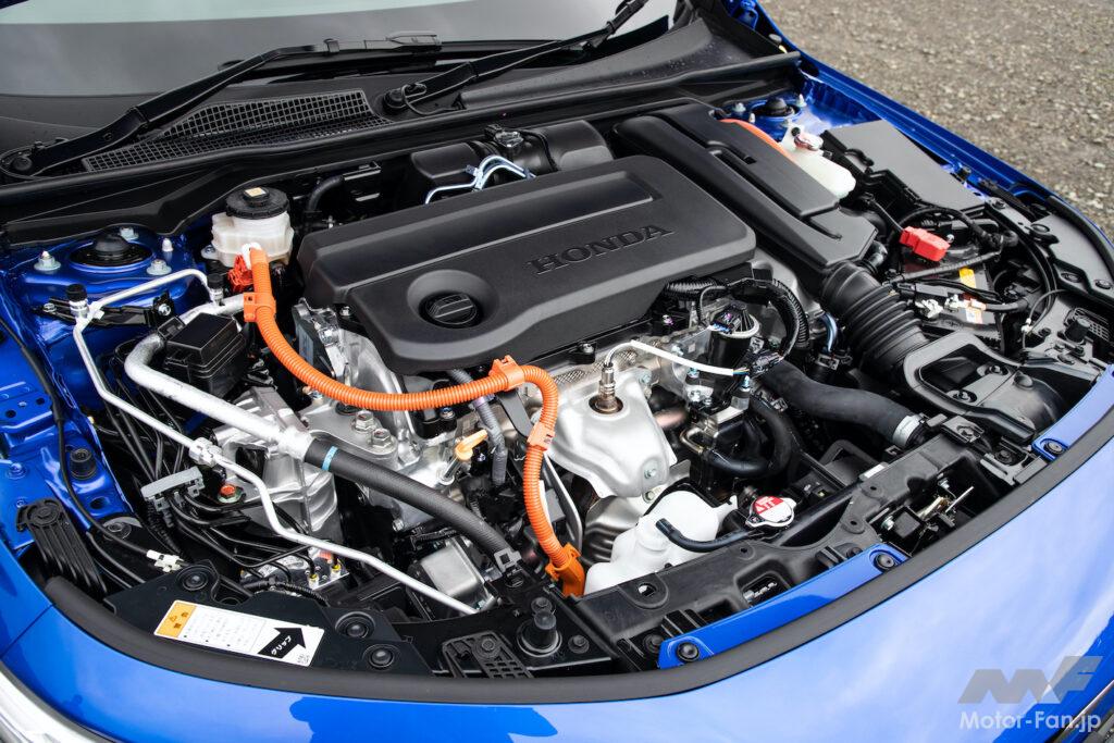 新しいシビックに搭載されるe:HEVは、実質的な前身であるインサイトのそれに対して、2モーター内蔵のハイブリッドユニット本体(も大幅に改良されているが)以外をすべて新開発した。モーター出力を引き上げて、バッテリーはセル数を増やしながらも小型軽量化。さらに、エンジンも新開発。世界最高レベルの熱効率(最大41%)を豪語する2.0リッター直噴ガソリンである。