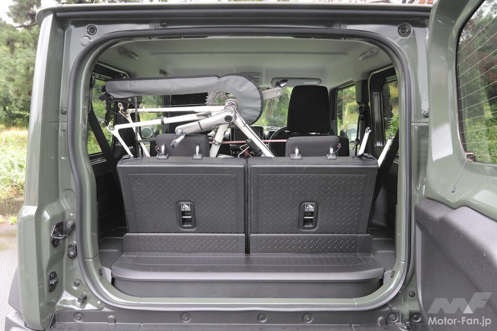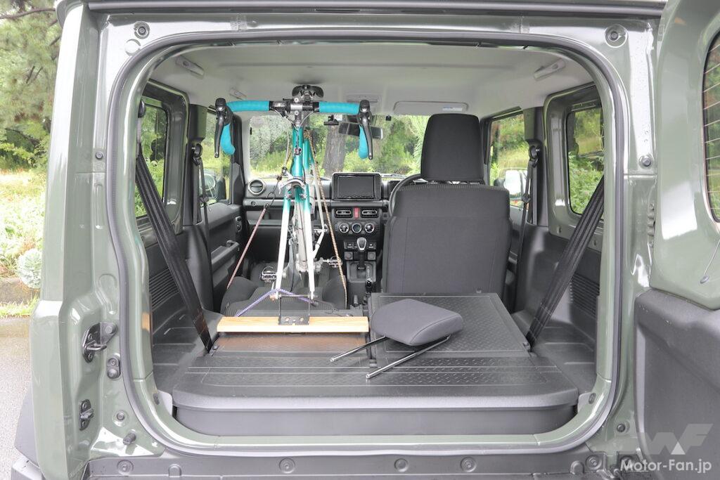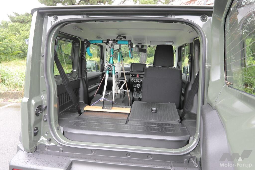 ジムニーは3ドアなので、さすがに積み降ろしはしにくいかと思ったら、意外なほど楽だったこともお伝えしたい。この作業も助手席ドアから行ったが、ウォークイン機構を作動させるだけで、僕のバイクでも問題なく通る。前向きにアプローチすれば、ある程度入ったところで車内に足が着けるので、腰への負担もそれほど増えない。