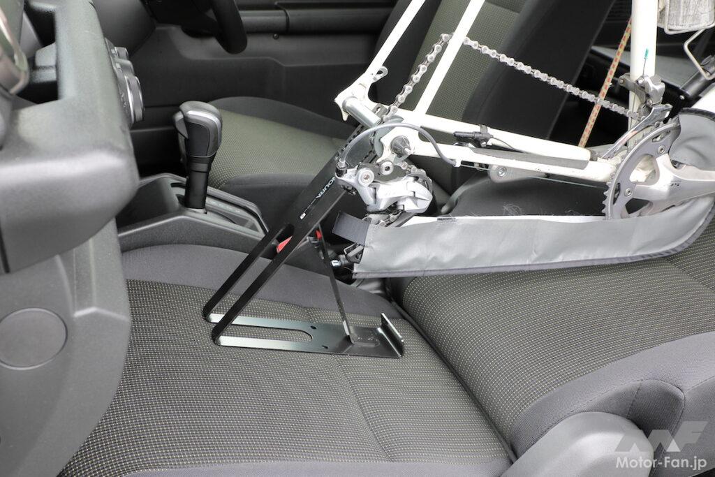 問題は固定方法だが、前輪側は後席背もたれ全体か、チャイルドシートのトップテザーアンカーにストラップをかけてハンドルに回せばしっかり止まる。後輪側は前席背もたれにストラップかバンジーコードを回し、上下の動きを抑えれば良い。横方向は、後席アシストグリップがうまく利用できそうだ。